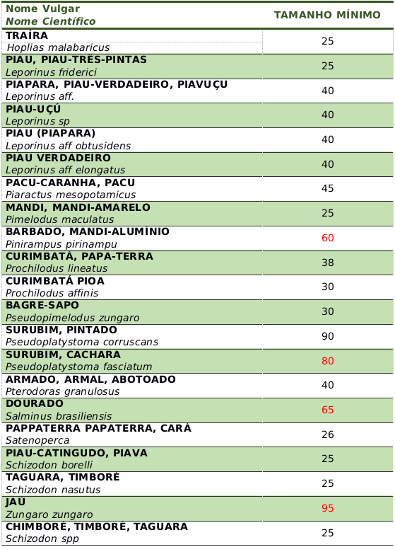 Art. 15 – Além dos dispositivos no artigo anterior, também não serão considerados os exemplares das espécies que não atenderem o tamanho mínimo para a captura exigido pela legislação vigente, conforme determina Instrução Normativa – IBAMA n° 26/2009 e o Decreto Estadual n° 12.039/2006.