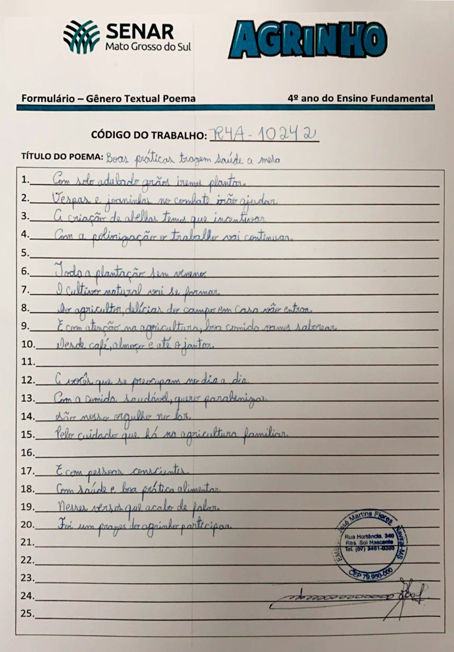 Promovido pelo Sistema Famasul, por meio do Sernar-MS, o Concurso Agrinho 2022 entregou 126 prêmios para primeiro, segundo e terceiro lugares nas categorias Desenho, Redação, Escola Agrinho, Experiência Pedagógica, das instituições públicas e privadas de todo o estado do Mato Grosso do Sul, que participaram do programa e enviaram seus trabalhos para o concurso cultural.