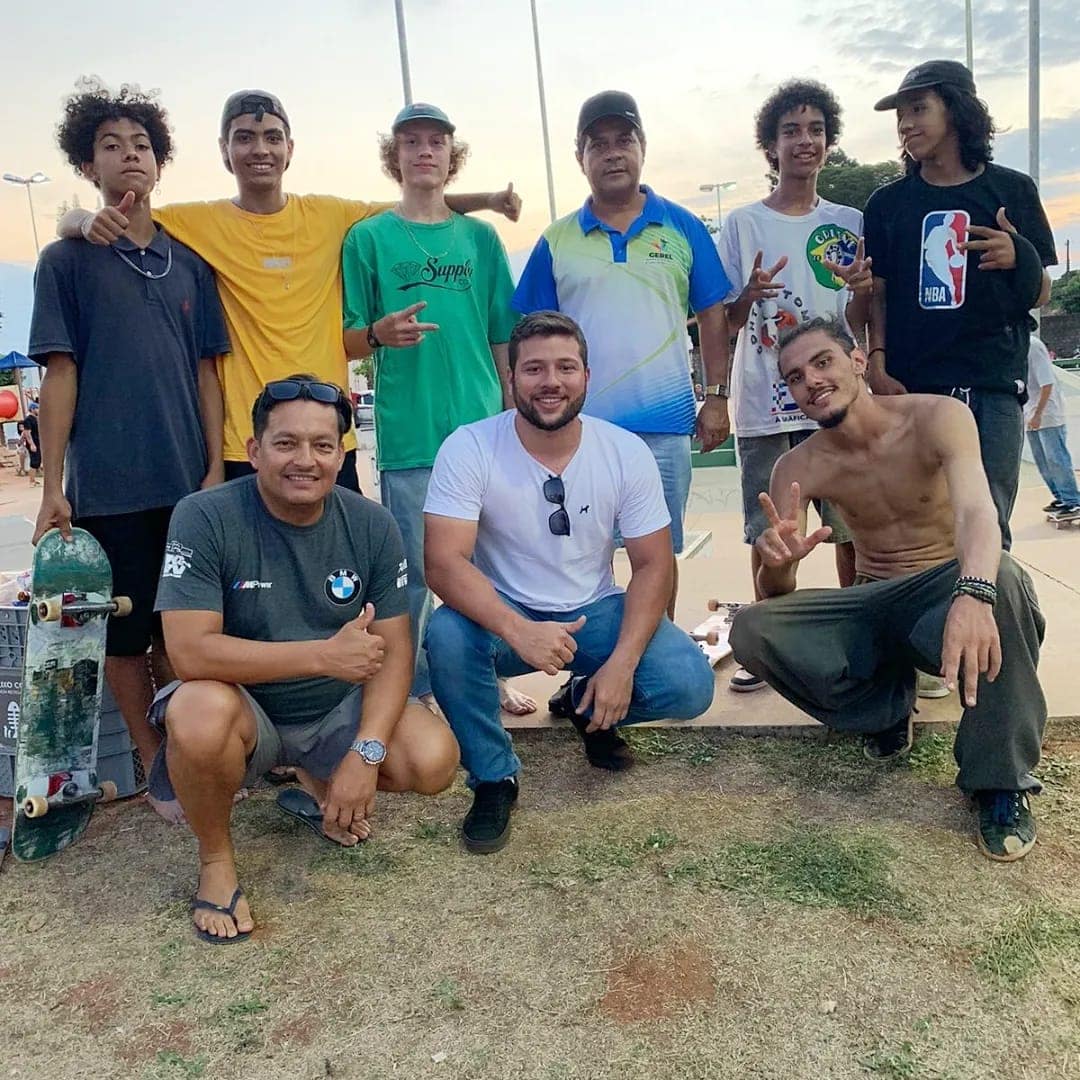 O gerente de Esporte Brendo Caíque (ao centro), com a equipe da Gerel e o skatista João Grilo, durante o 1º Campeonato de Skate Aberto 2022 de Naviraí.