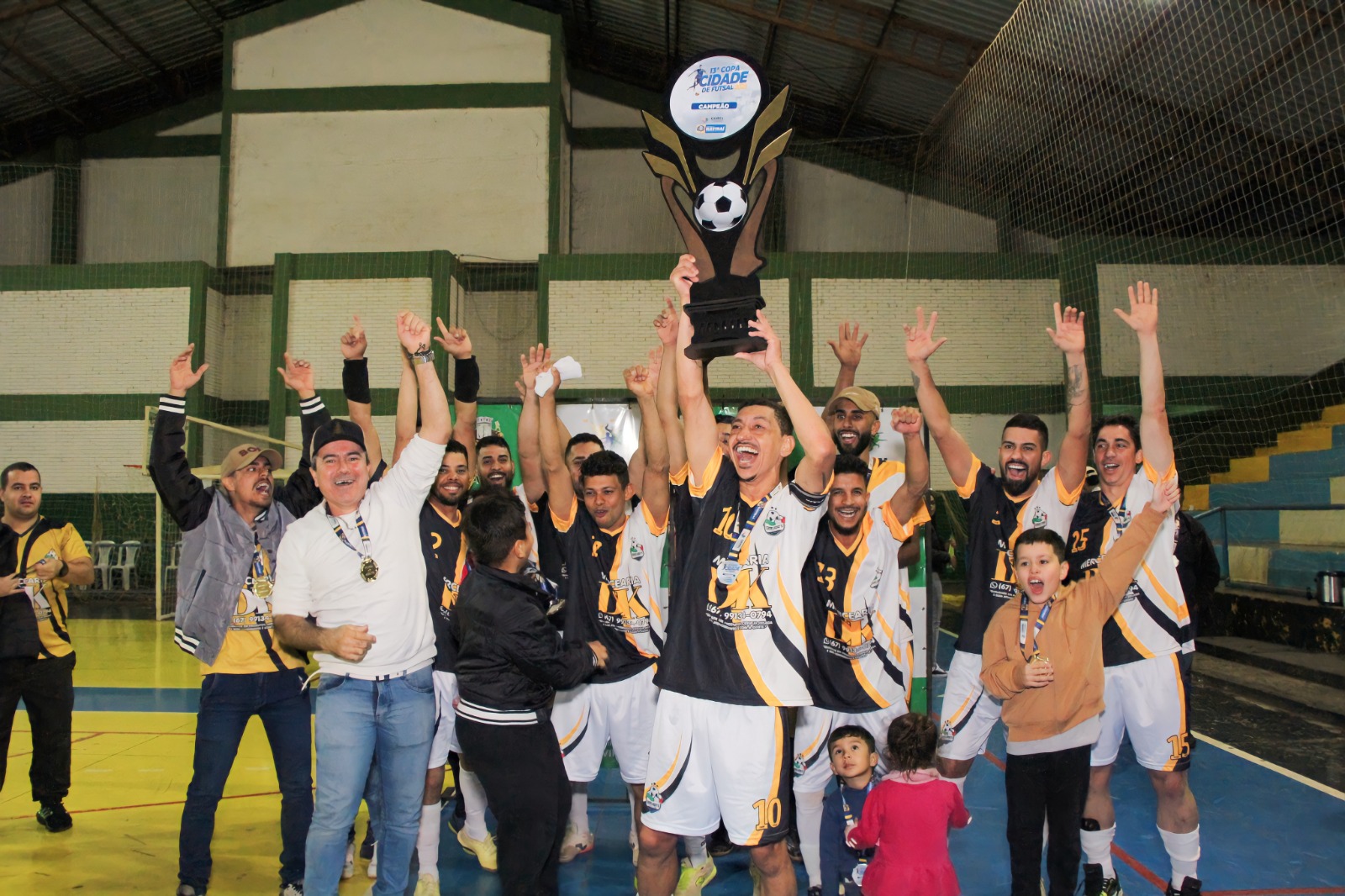 Capitão do Caneludo’s/Fogo Atacadista levanta a taça da 13ª Copa Naviraí de Futsal em comemoração com os atletas pela conquista do título de campeão. © FestaDoDia/Fabíola Ramires
