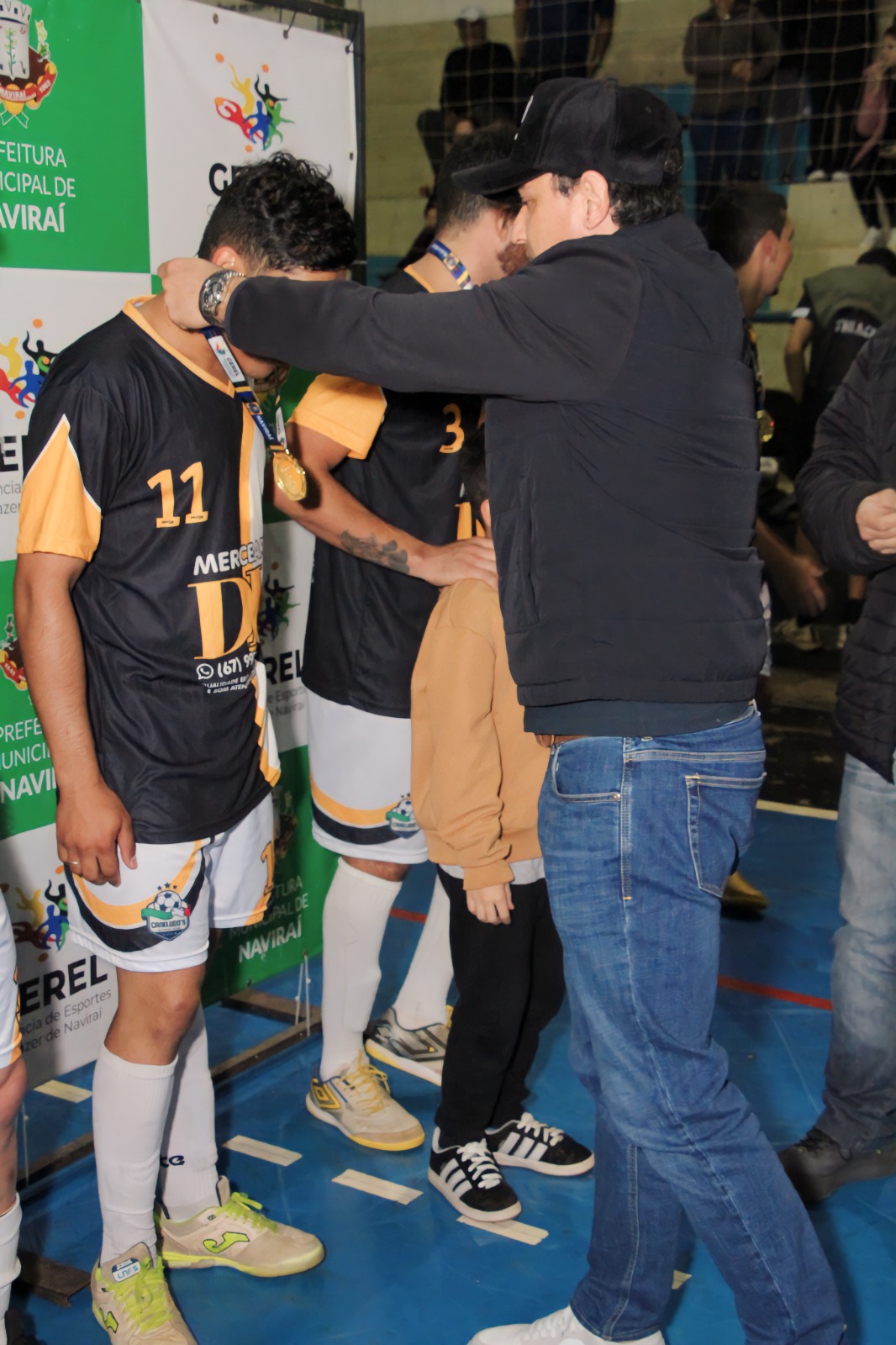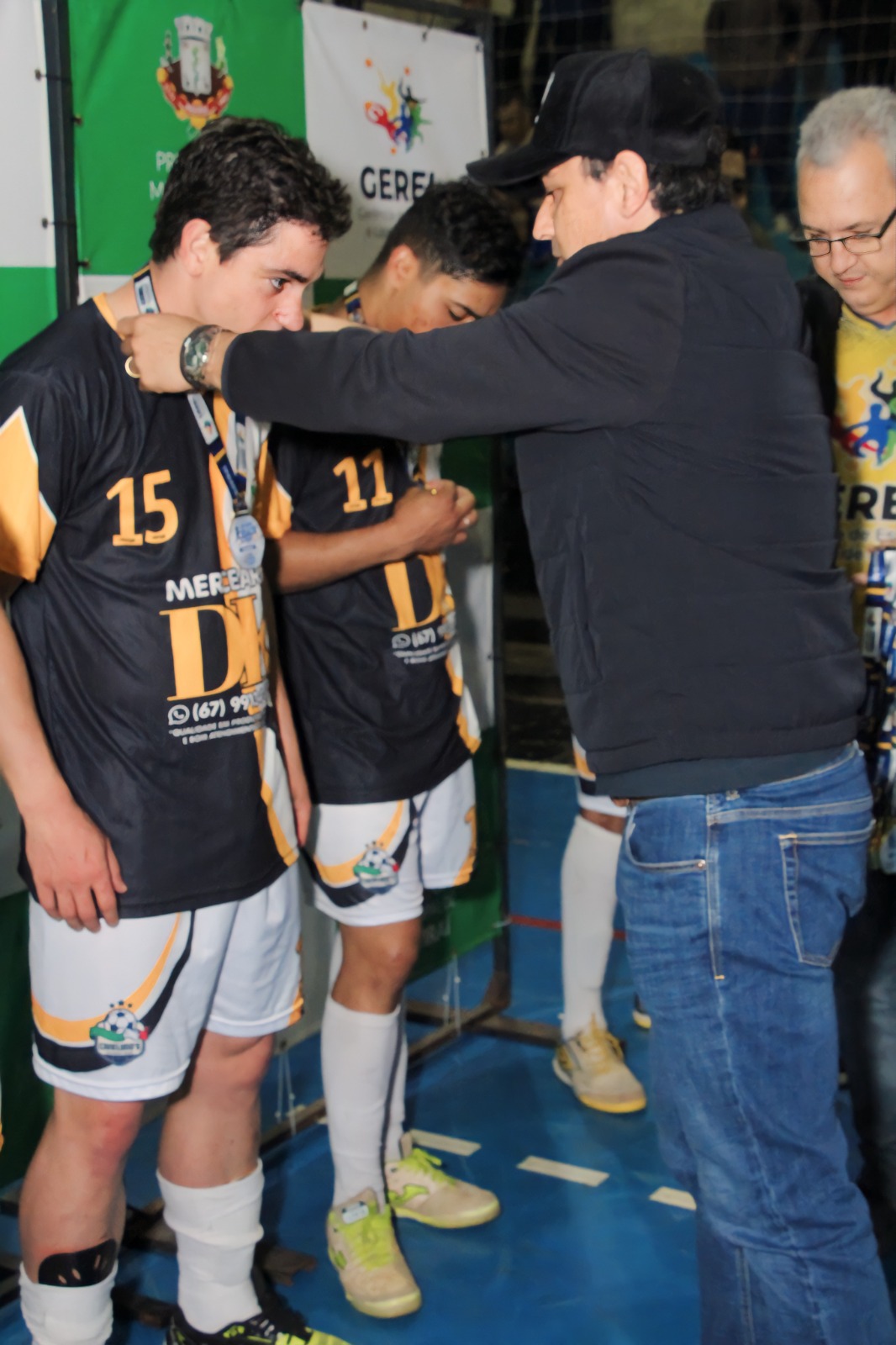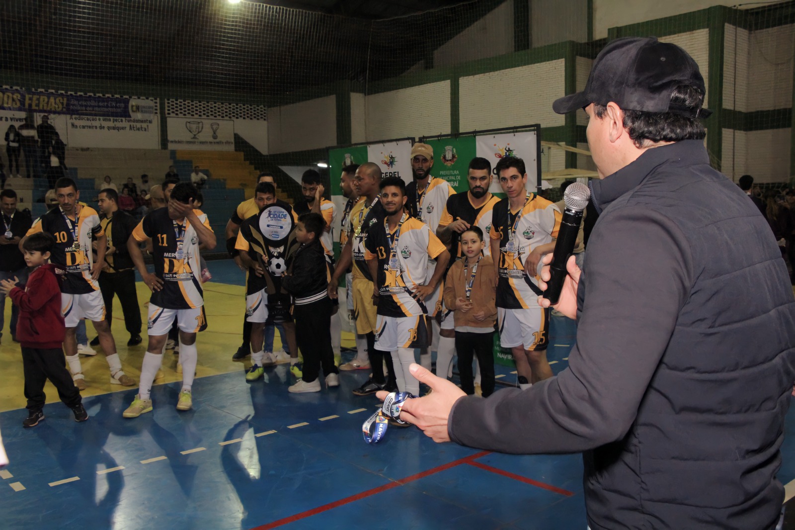 Prefeito Rodrigo Sacuno parabenizou o times vice-campeão e campeão da 13ª Copa Cidade Naviraí de Futsal Masculino. © FestaDoDia/Fabíola Ramires