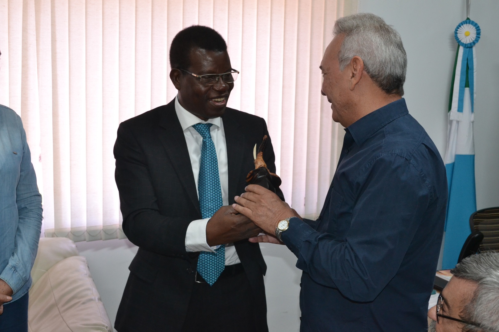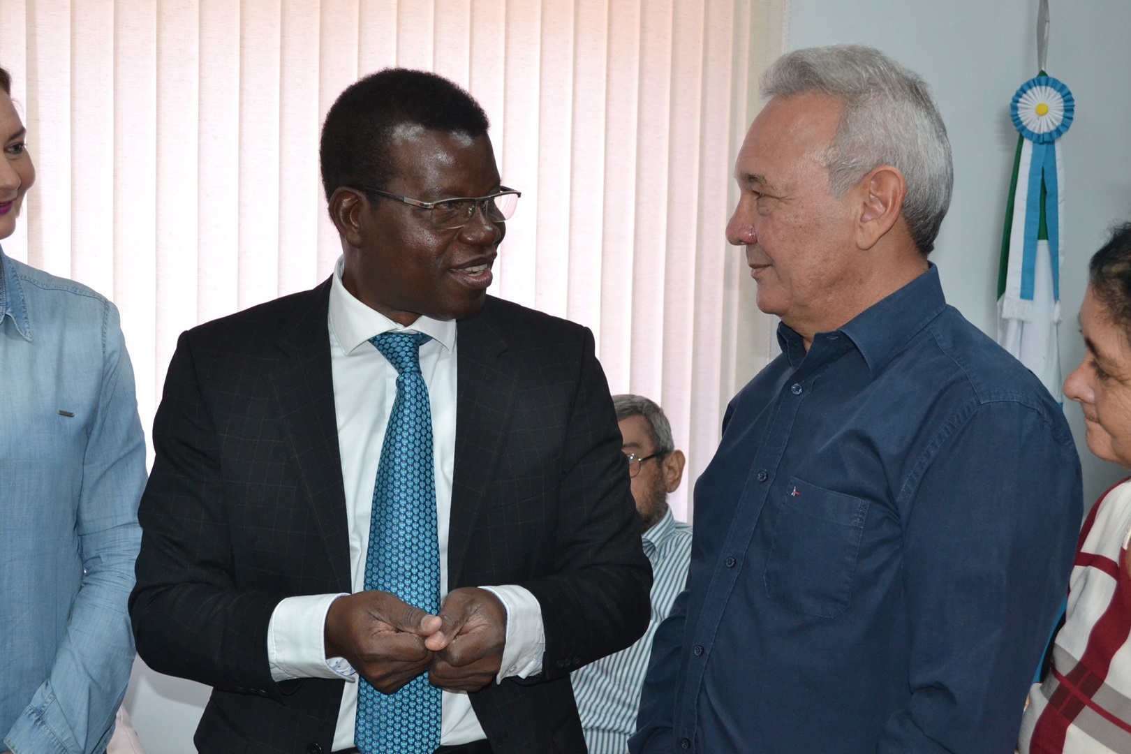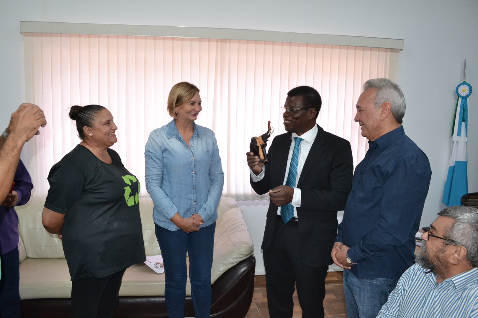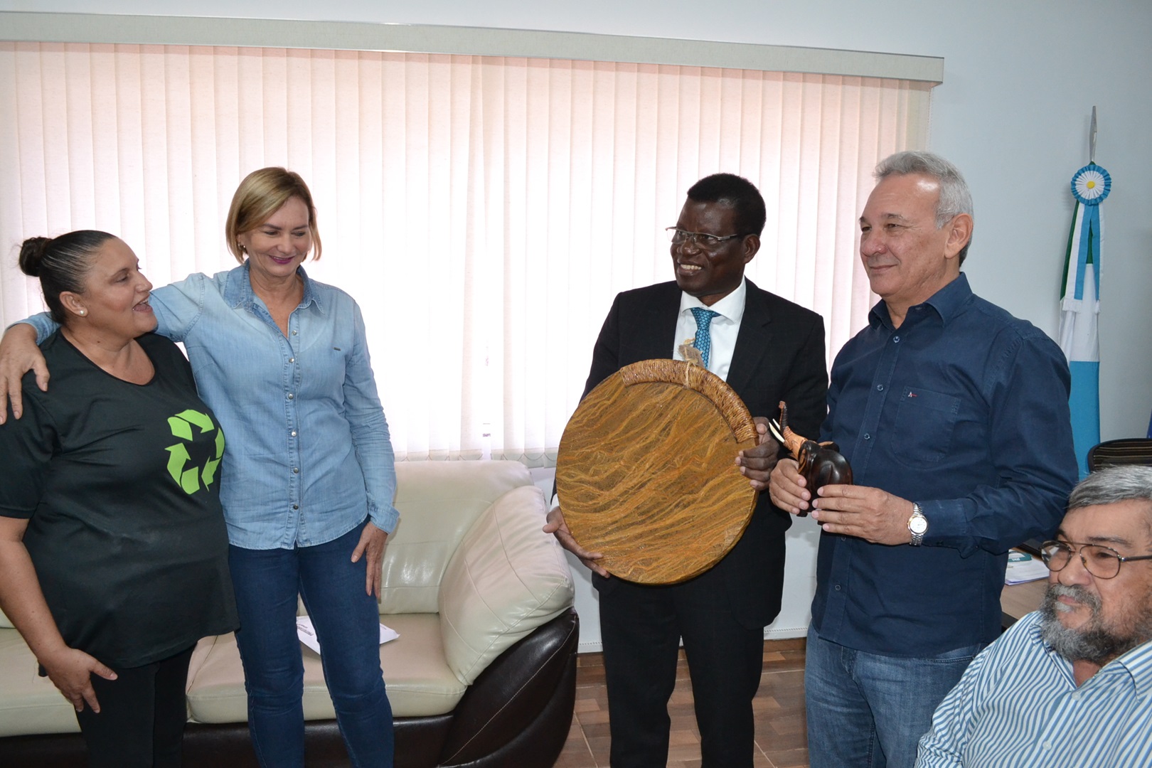 O prefeito Dr. Izauri Macedo, acompanhado do vereador Jaimir José da Silva, gerentes municipais e outras lideranças recebeu em seu gabinete na manhã desta sexta-feira, dia 13 de março, a visita do Cônsul da República da Costa do Marfim, Tibe Bi Gole Blaíse, que se fazia acompanhar do Adido Administrativo Isaías Rossi e de José Santana Júnior, Adido Jurídico do Consulado, além da professora Mirian Coura Aveiro (UFMS), coordenadora do projeto da Incubadora de Frango Caipira do Assentamento Juncal e Aldenor da Silva Ferreira, também da UFMS, campus Naviraí. Também acompanhou os visitantes, Joel Bahia, coordenador regional da AGRAER, Dona Cida, da AMAJU membro da Cooperativa dos Produtores de Frango Caipira da Juncal.