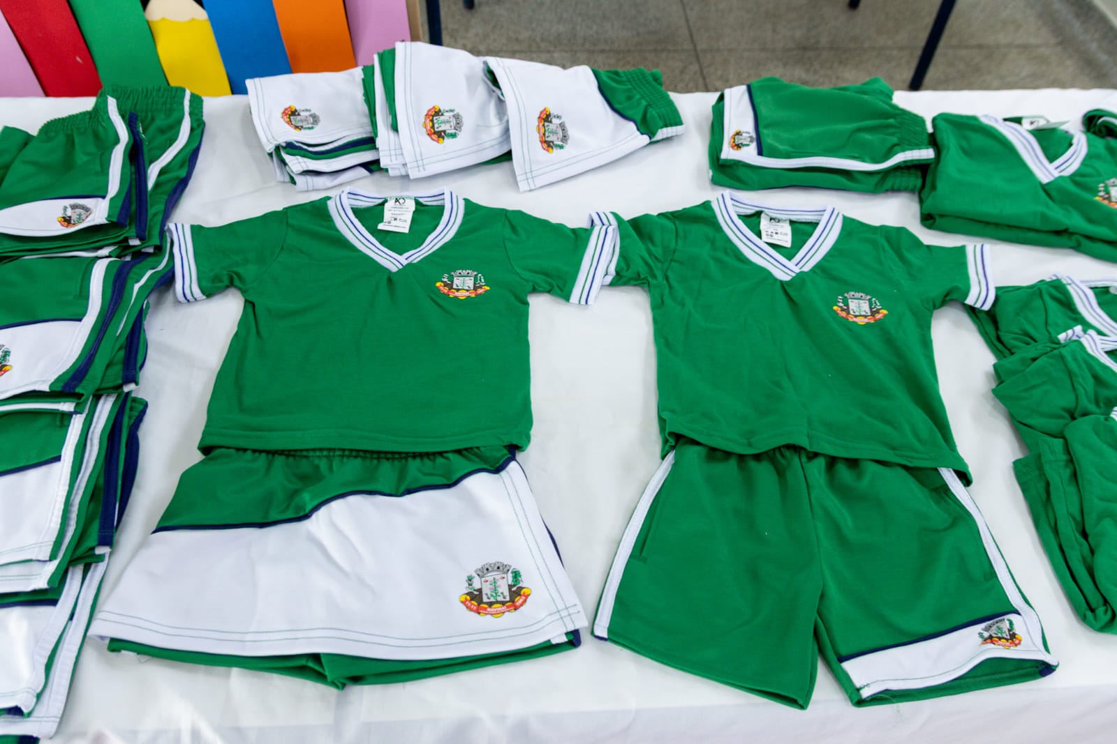 A entrega simbólica de kits de materiais escolares foi realizada no CIEI Professora Azena Ricco de Freitas e contou com a presença de alunos, professores e funcionários da escola.