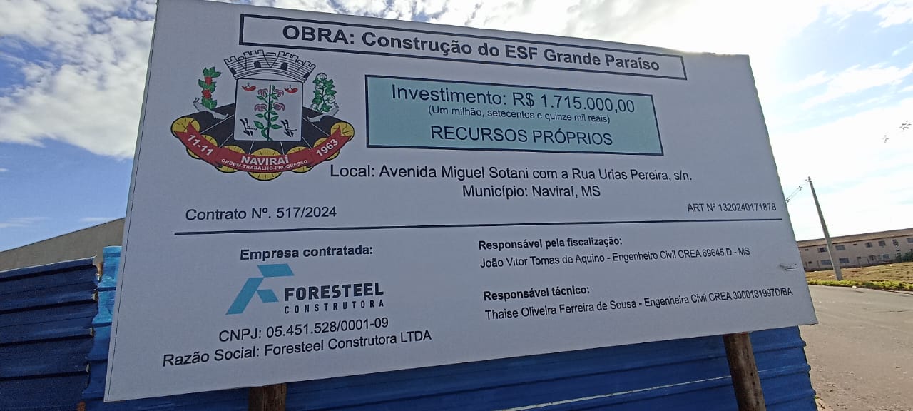 A construção do ESF Grande Paraíso exige um investimento de R$ 1.715.000,00 de recursos próprios da Prefeitura de Naviraí. O novo posto de saúde da cidade está localizado nos altos da Avenida Miguel Sotani, esquina com a Rua Urias Pereira. A obra é resultado do Contrato Nº 517/2024, tendo a empresa Foresteel Construtora Ltda., vencedora da licitação e contratada para a execução de todo o empreendimento.