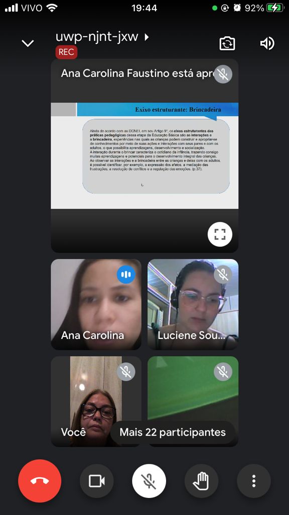 Formação círculo de palestras dialogadas pelo Meet com os professores da pré-escola.