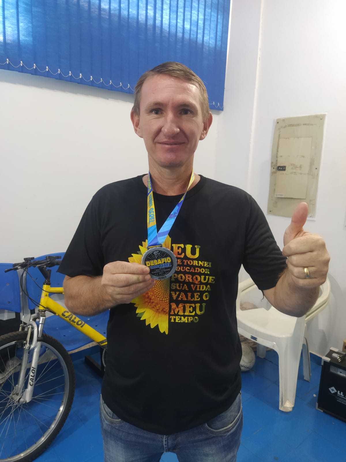 Um dos ciclistas que recebeu medalha entregue pela prefeita Rhaiza Matos, pela participação no 1º Desafio Virtual Solidário de Mountain Bike.