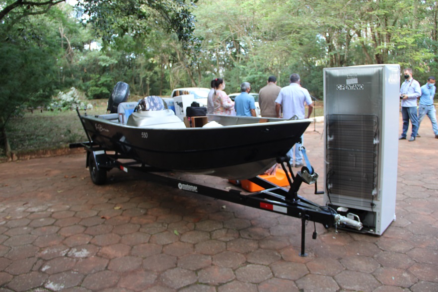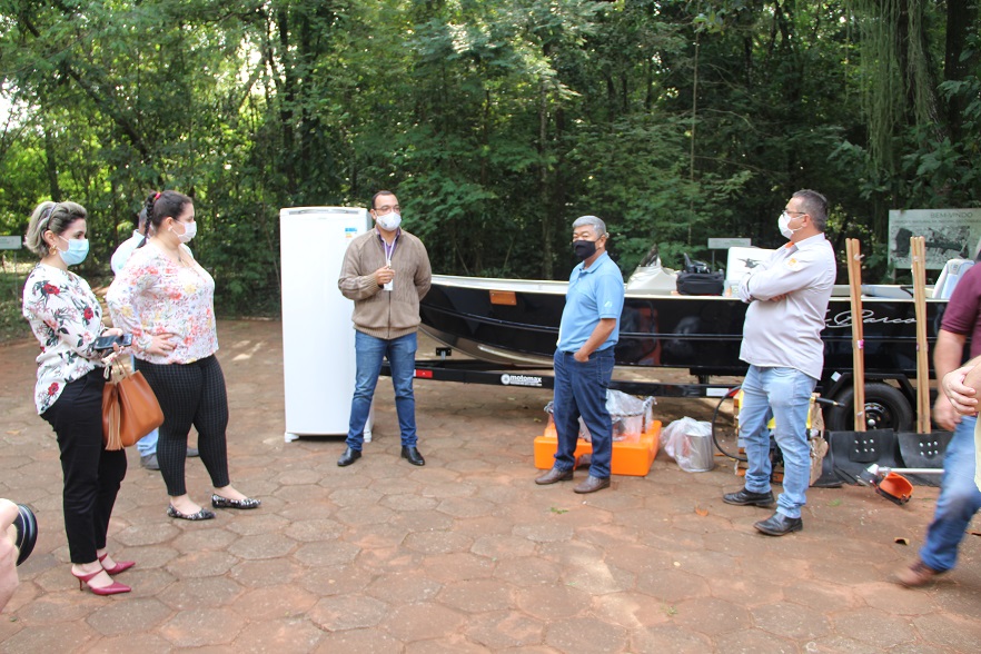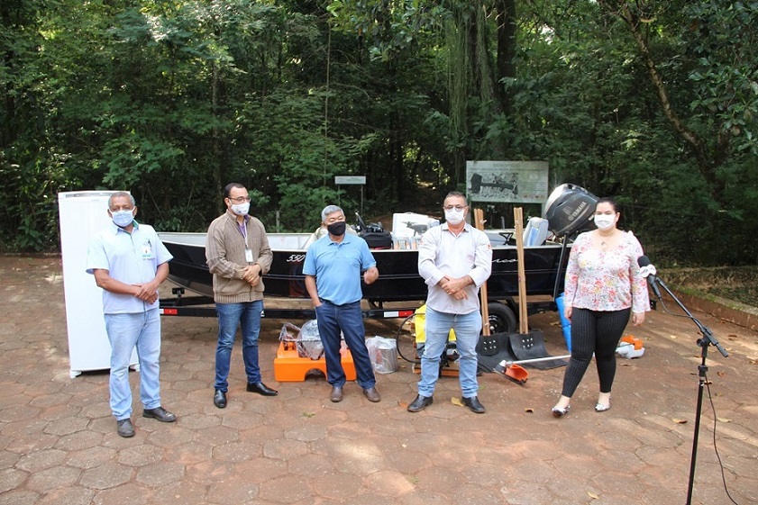 Dentre os 31 itens entregues pela diretoria da cooperativa à prefeita Rhaiza Matos estão uma lancha, motor de popa, carretinha e drone