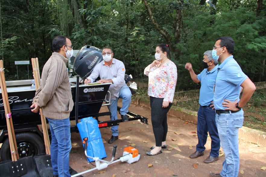 A prefeita Rhaiza Matos e o gerente Luiz Alberto Ávila Júnior (Meio Ambiente) em ato na sede da Gerência de Meio Ambiente (Bosque Municipal Cumandaí), receberam os equipamentos entregues pelos diretores da Copasul Gervásio Kamitani (Presidente), Nelson Antonini (Vice-presidente) e Diogo Mussi Barbosa da Silva (Engenheiro Ambiental).