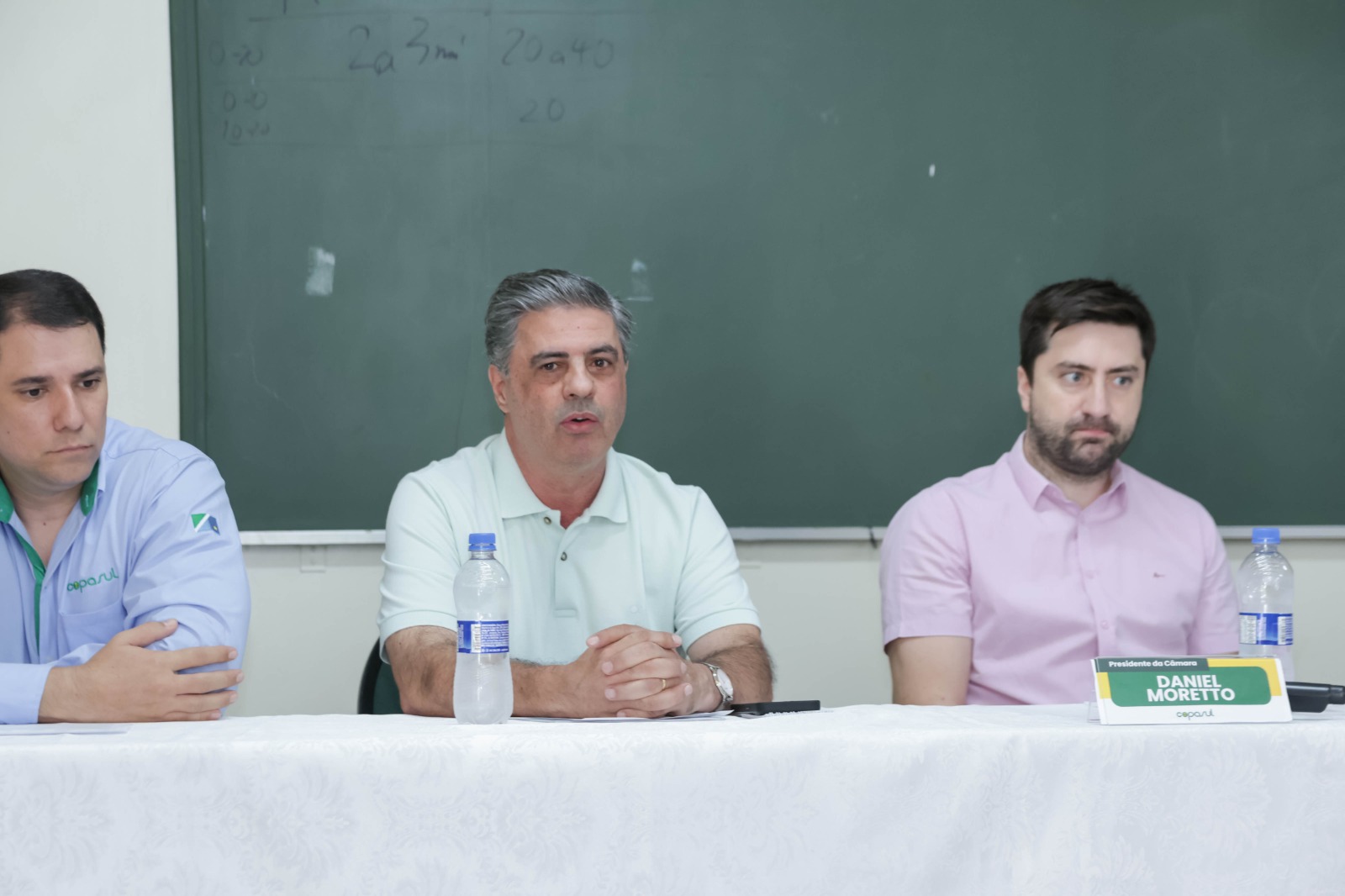 Diretores da Copasul, lideranças do Executivo Municipal, da Associação Comercial e Industrial e da Câmara de Vereadores participaram do anúncio durante coletiva à imprensa. ©Roni Silva/PMN