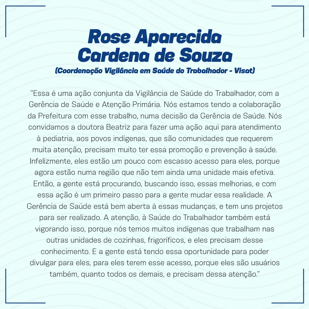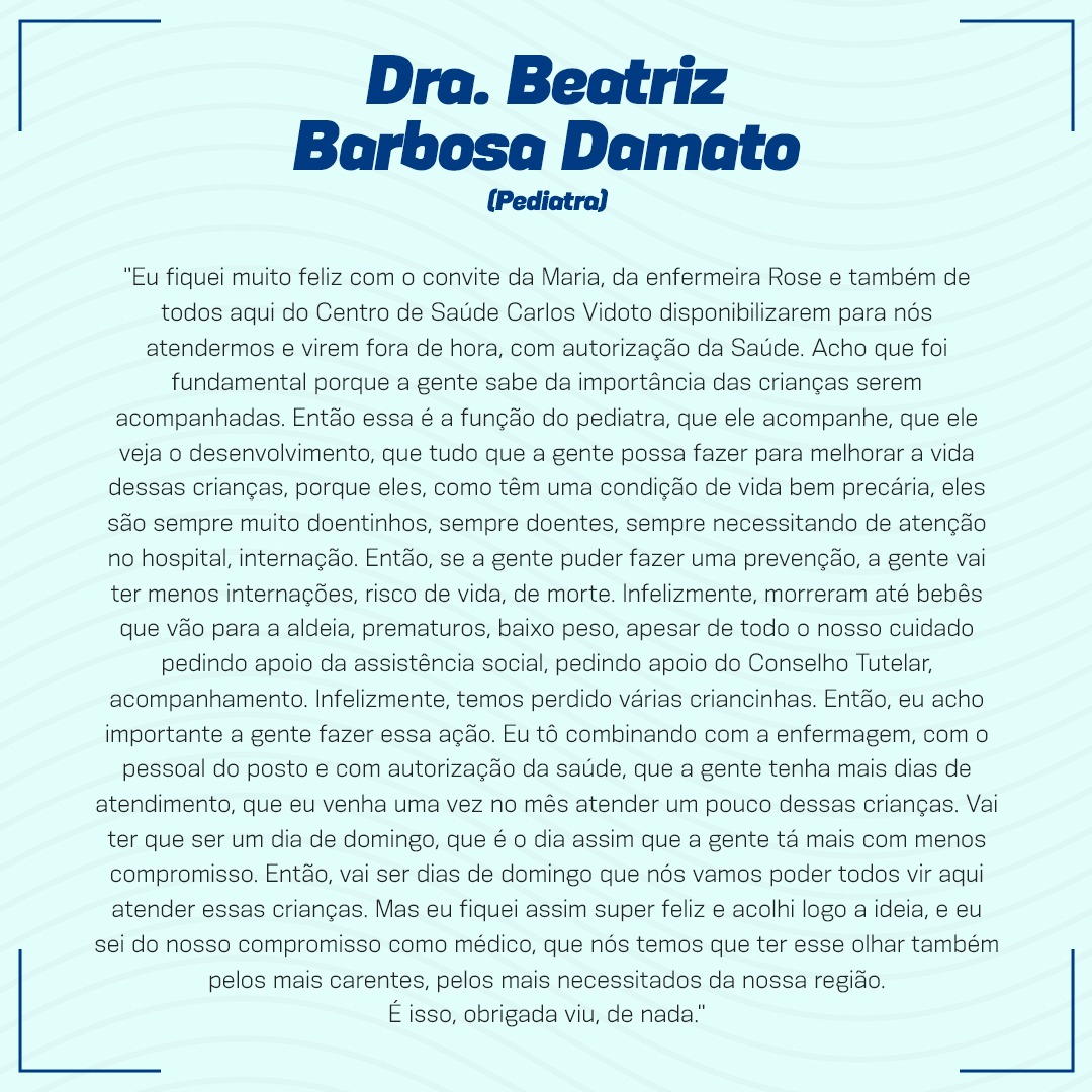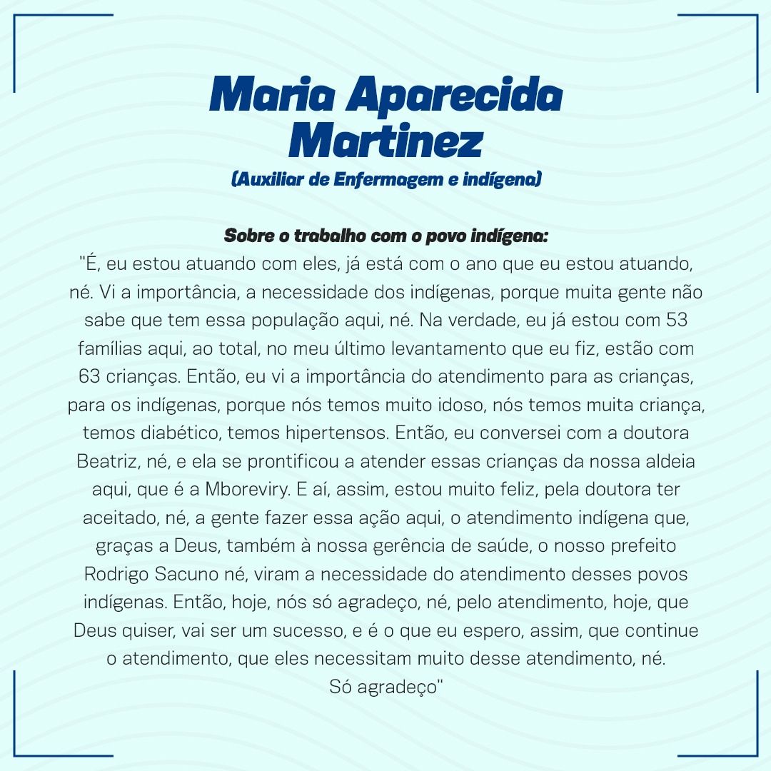 “Nós contamos com quatro profissionais para esta ação de saúde dominical, sendo uma Pediatra, a Dra. Beatriz Barbosa Damato; uma Clínica Geral, Dra. Bianca Eduarda Marco Michelotto; uma Enfermeira, Rose Aparecida Cardena de Souza; e a Auxiliar de enfermagem, a indígena Maria Aparecida Martinez, que também atuou como mediadora cultural e linguística. Foi um trabalho inédito com resultado bastante positivo”, afirma a gerente municipal de Saúde, Dra. Ângela Castro Lopes.