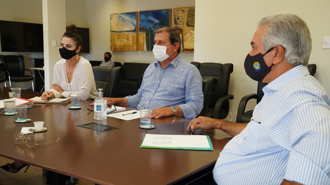 Governador Reinaldo Azambuja (ao centro) ao receber reivindicações da prefeita Rhaiza Matos, avalizadas pelos deputados Mara Caseiro e Paulo Corrêa.