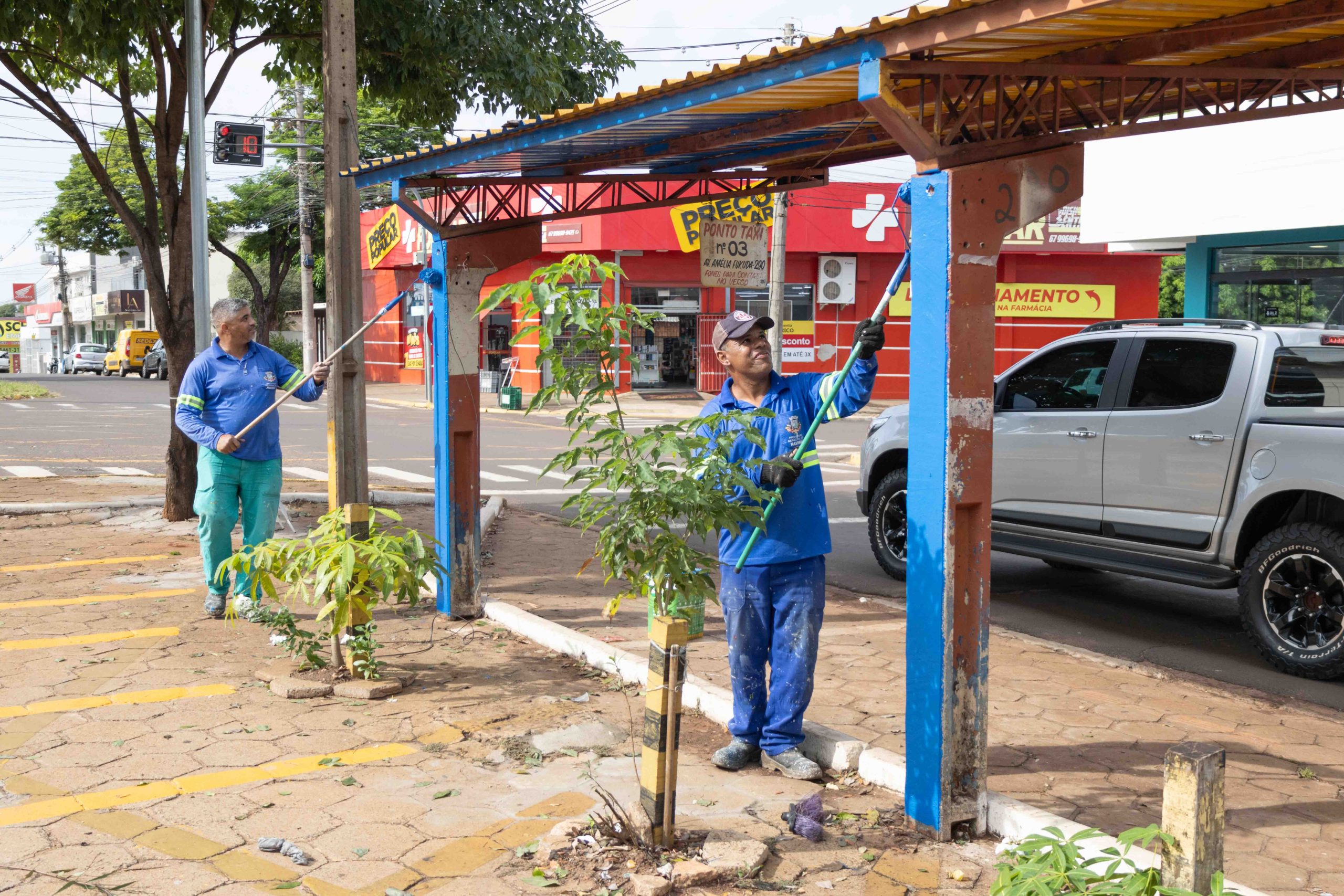 Servidores da Prefeitura iniciam a pintura da estrutura física do Ponto de Táxi nº 03, na Avenida Amélia Fukuda. ©Roney Minella/PMN