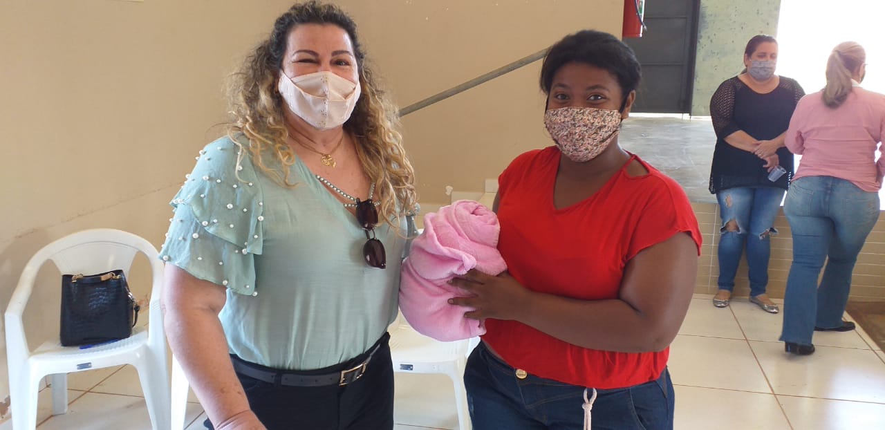 Gerente de Assistência Social Lucinéia Pulquério Franciscatti ao entregar cobertor à dona de casa contemplada pelo projeto “Aquecendo com Amor. Foto: Roney Minella