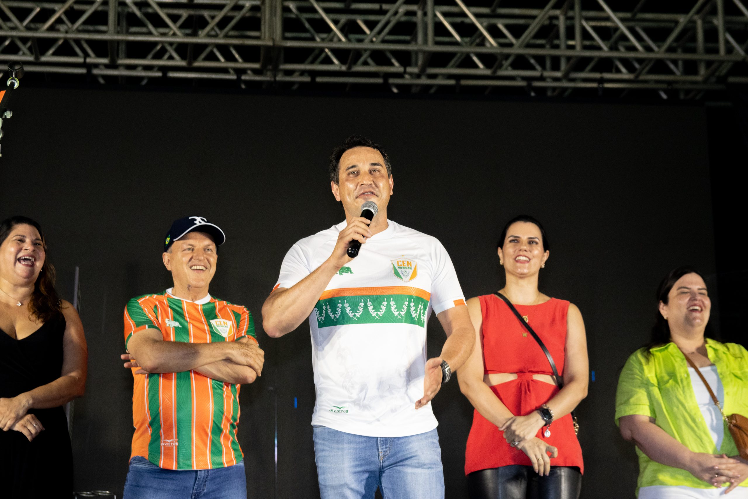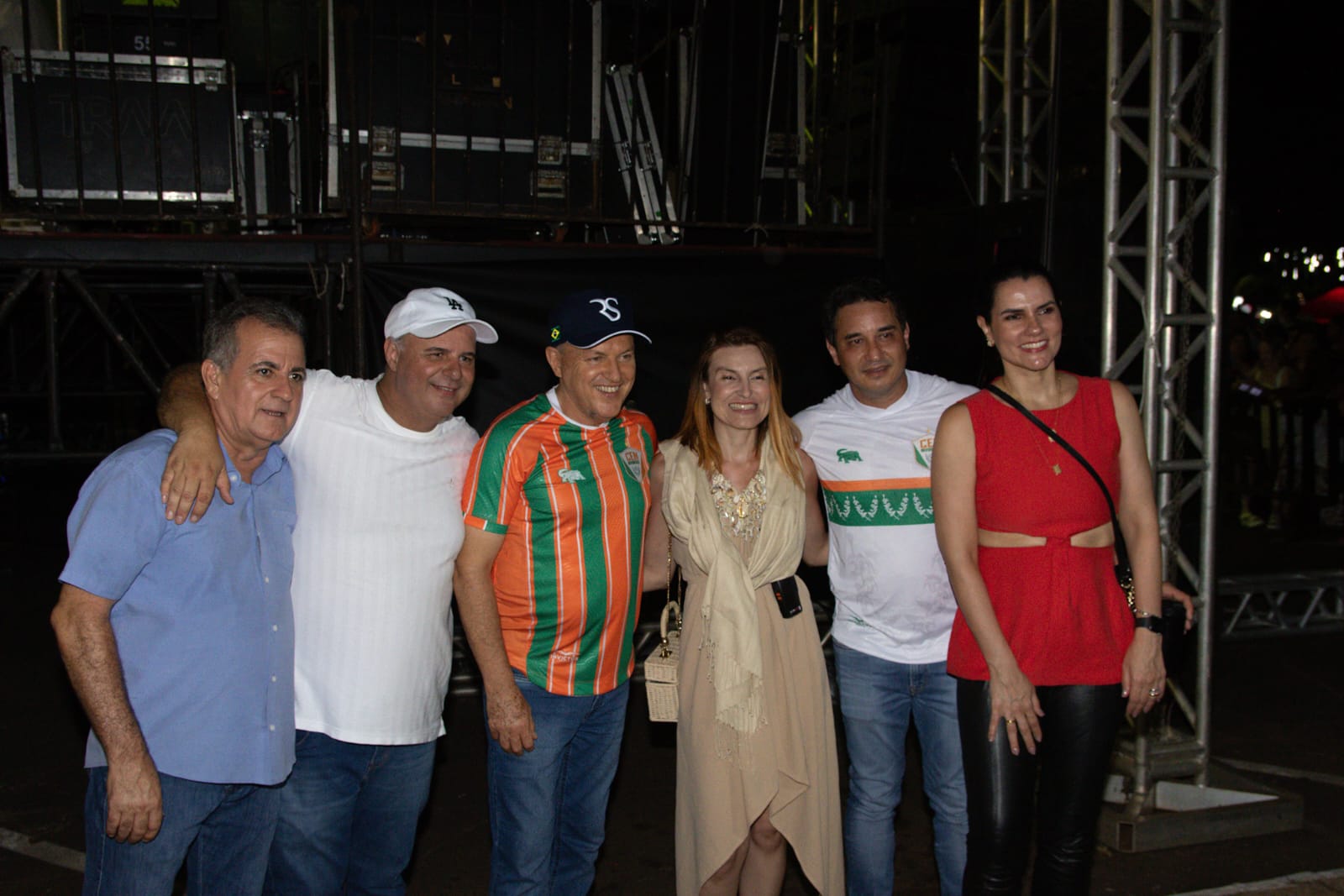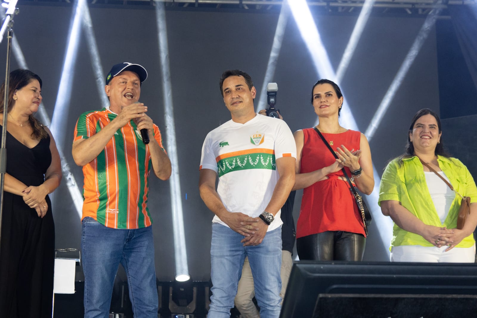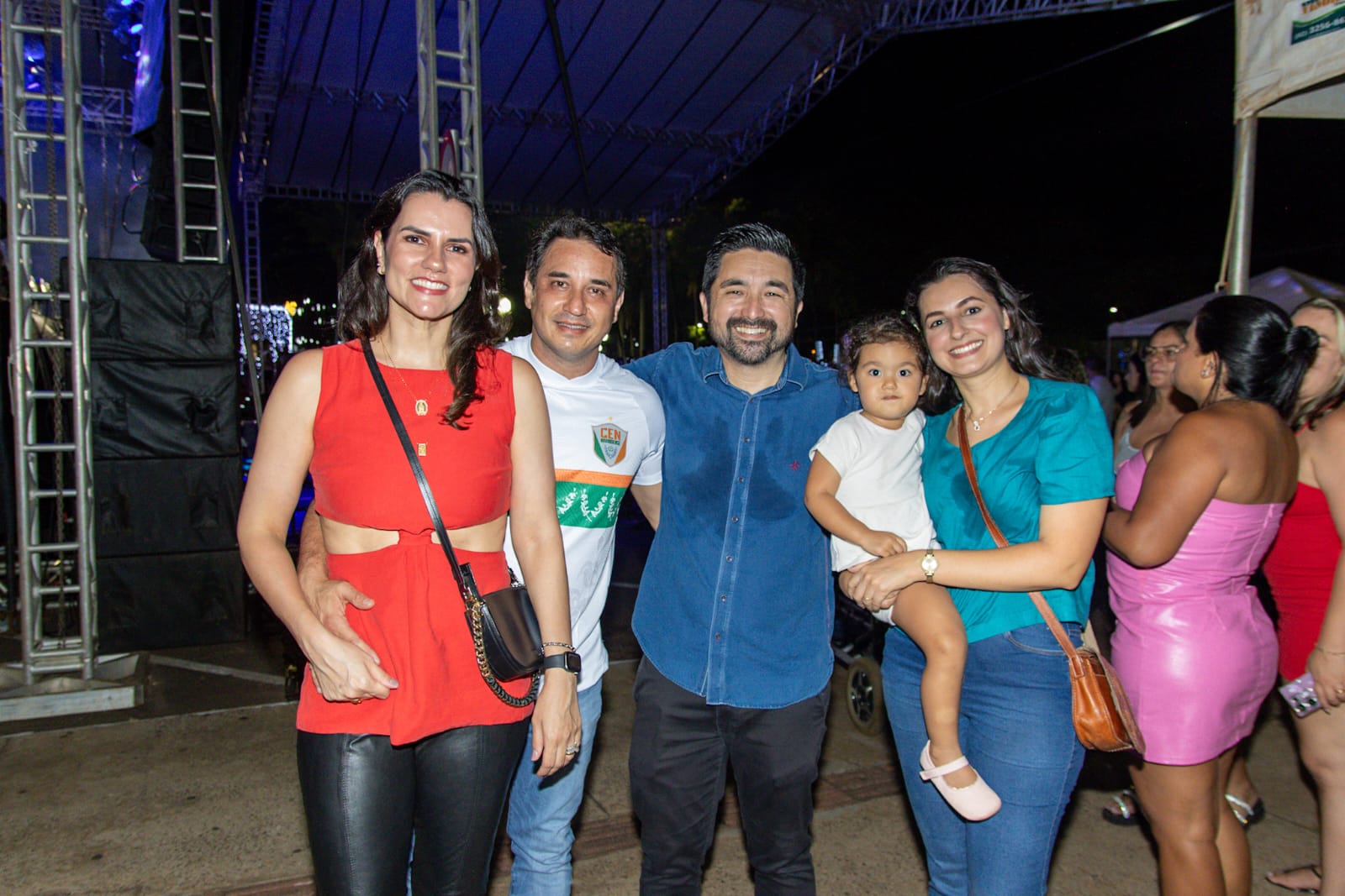 O Registro das autoridades durante a primeira noite de festividades na Praça. Na imagem, da esquerda para a direita: Vereador Mário Nelvo, Vereadora Patrícia Capucci, Primeira-dama Naiza Capucci Sacuno, Prefeito Rodrigo Sacuno, Vice-prefeita Telma Minari e o Deputado Estadual Junior Mochi (foto: Roni Silva/PMN).