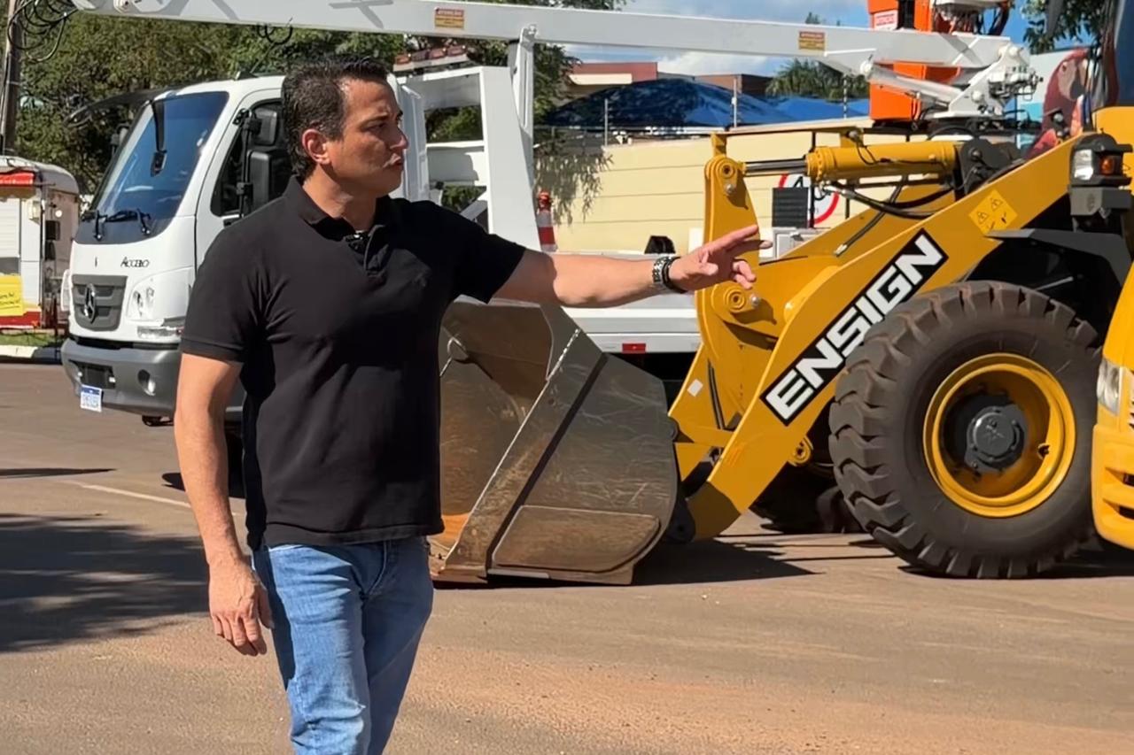 O prefeito Rodrigo Sacuno em frente à frota de maquinário e veículos, na Praça Prefeito Euclides Antonio Fabris. (Foto: Divulgação)