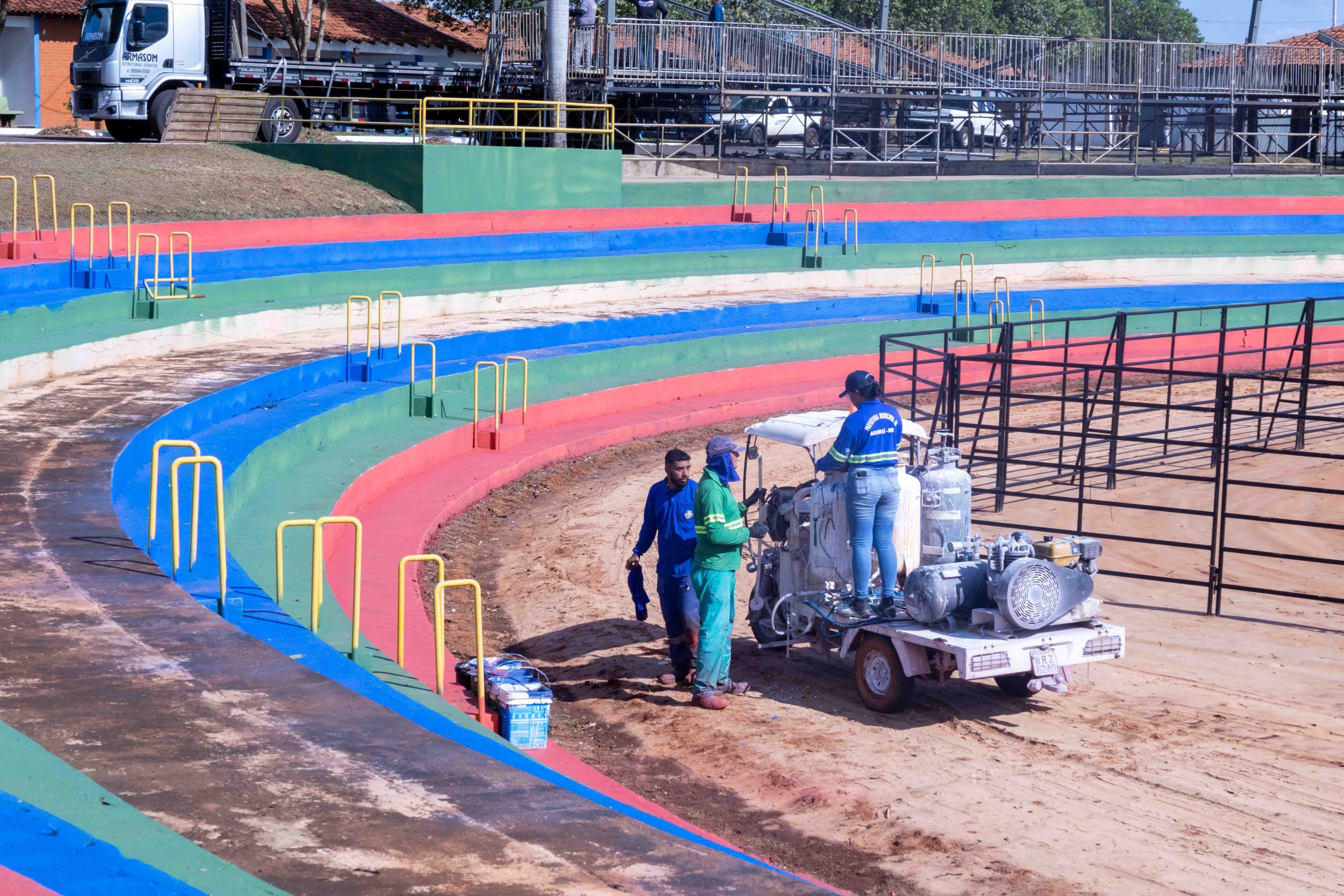 Equipes da Prefeitura e empresas contratas intensificam a montagem da estrutura para o Festival de Churrasco, Rodeio e Shows programados para a comemoração do aniversário de 62 de Naviraí.