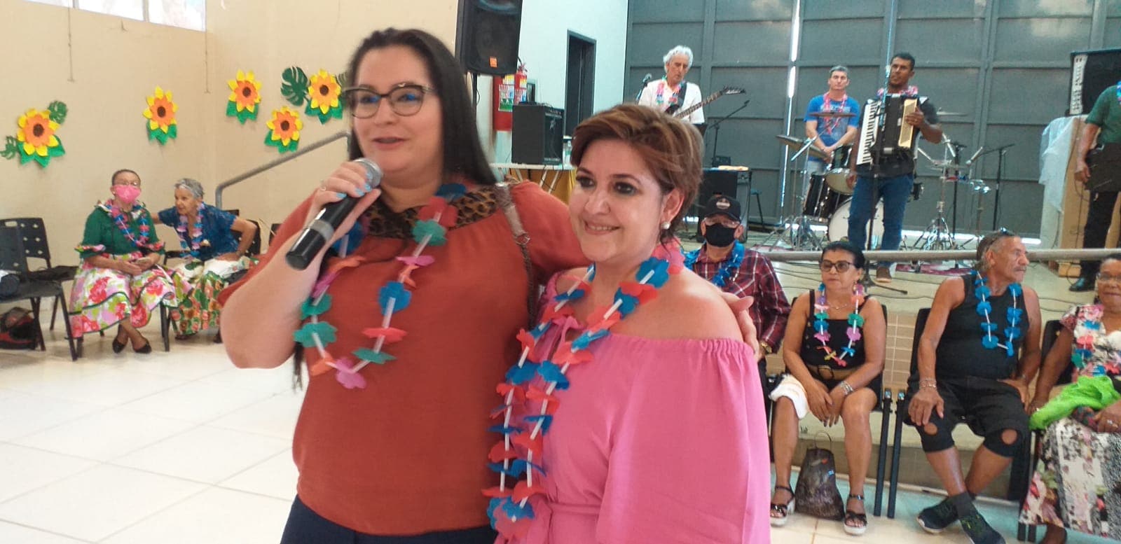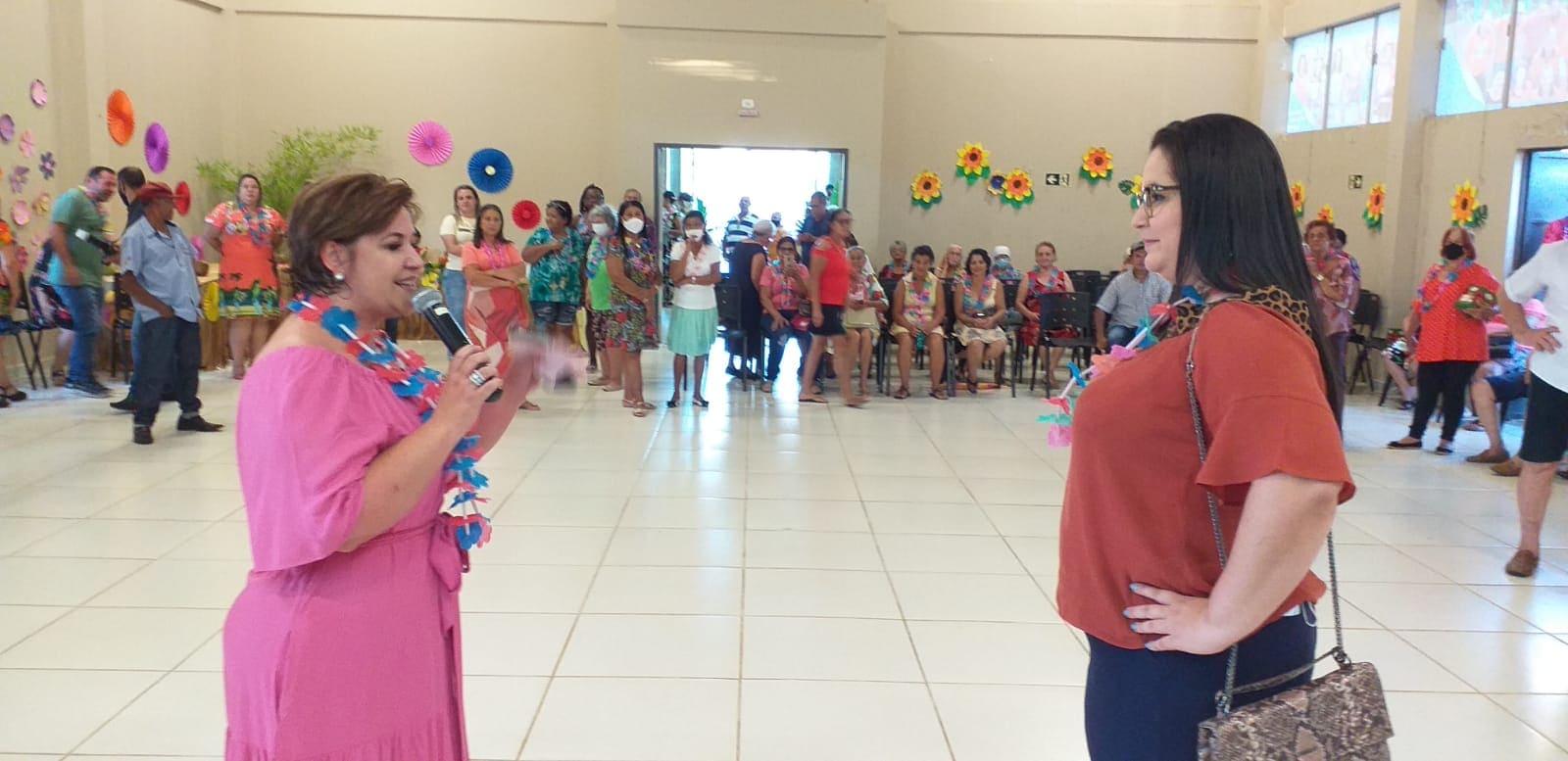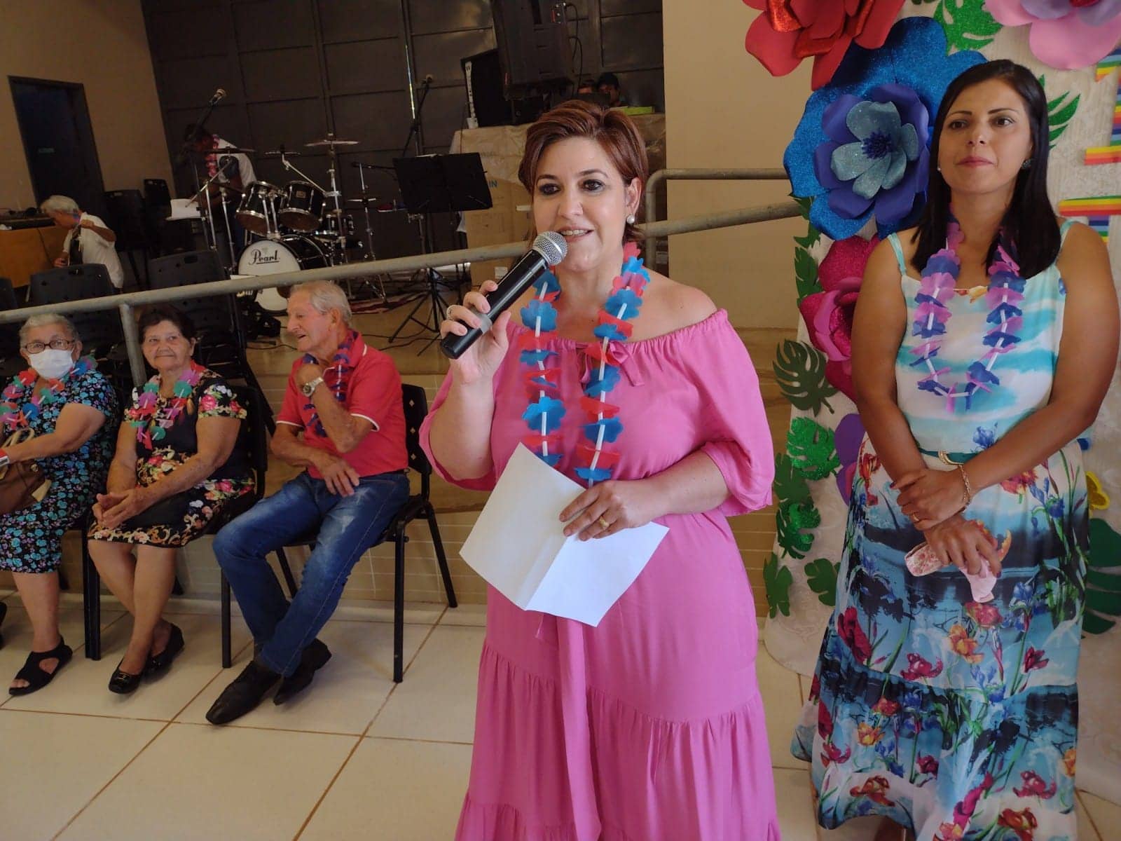 Prefeita de Naviraí (à esquerda) e a Gerente de Assistência Social da Prefeitura destacaram a realização ao “1º Baile Tropical” da terceira idade e desejaram Feliz Natal a todos os participantes. Foto: Roney Minella