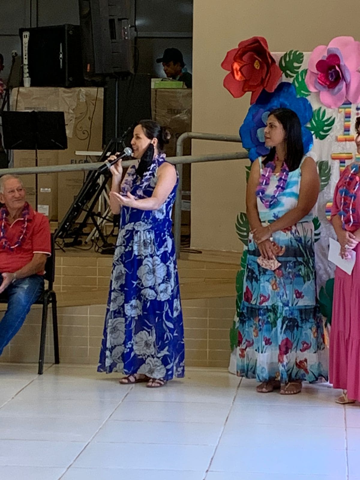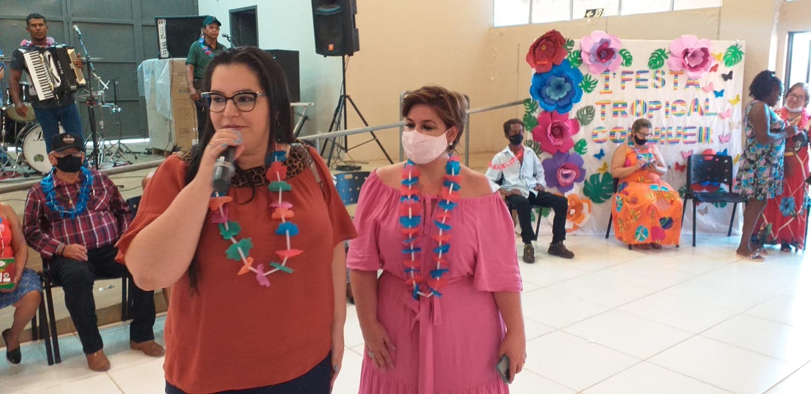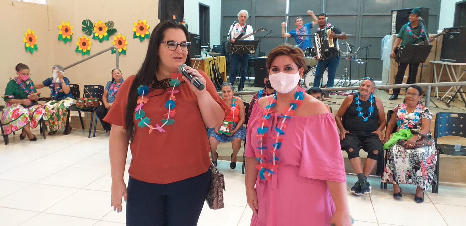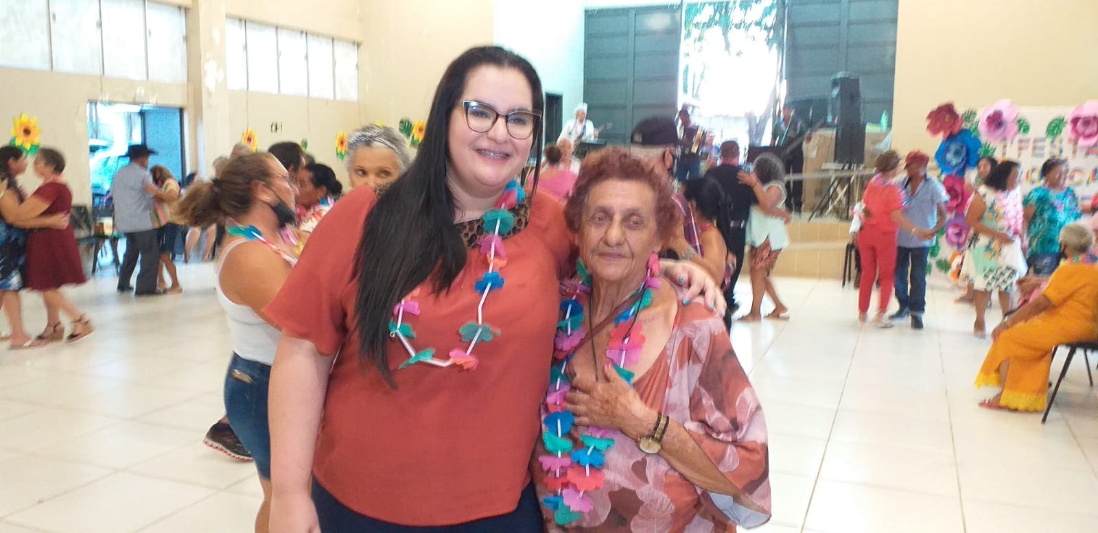 Prefeita de Naviraí (à esquerda) e a Gerente de Assistência Social da Prefeitura destacaram a realização ao “1º Baile Tropical” da terceira idade e desejaram Feliz Natal a todos os participantes. Foto: Roney Minella