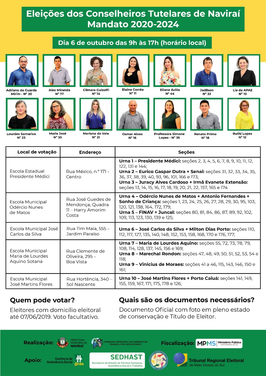 São 14 candidatos ao cargo de Conselheiros Tutelares, disputando 05 vagas. A comissão lembra que é de suma importância a participação da sociedade em estar votando nesse dia, pois a eleição desses conselheiros todos com requisitos aprovados comprovando idoneidade e com proposta para desempenhar suas funções que é fiscalizar e proteger as crianças e adolescentes.
