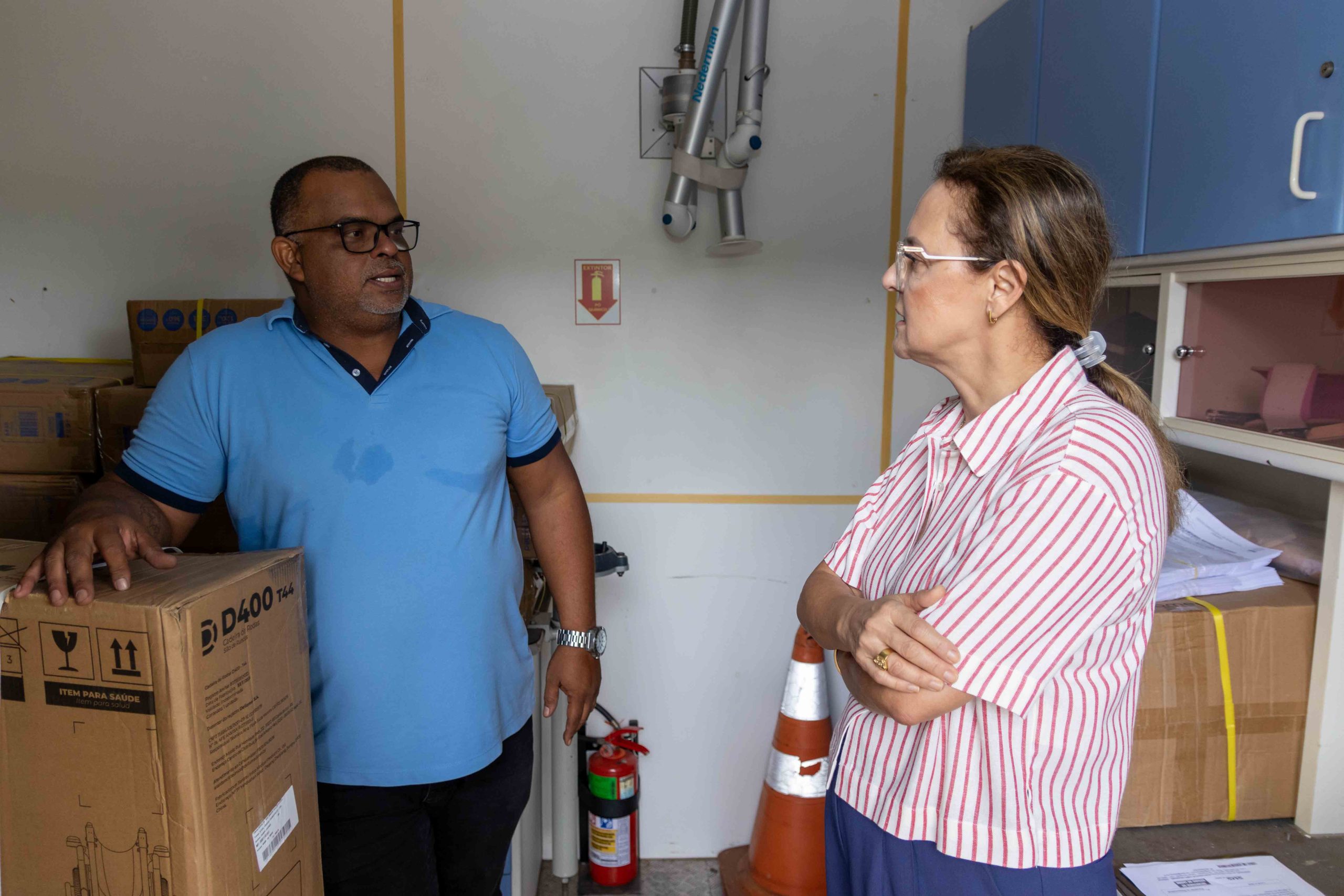 Gerente municipal de Saúde, Dra. Ângela Castro Lopes (à esquerda), acompanha ação de entrega de equipamentos através da Oficina Ortopédica da CER/Apae. ©Roni Silva/PMN
