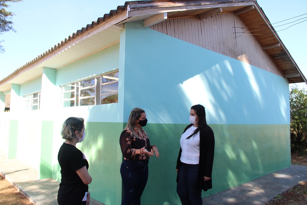 Prefeita Rhaiza Matos, gerente Tatiane Morch (Educação) e o vereador Éderson Dutra (presidente da Câmara), durante visita à sala de aula de escola inaugurada no Distrito Porto Caiuá. Foto: Roney Minella