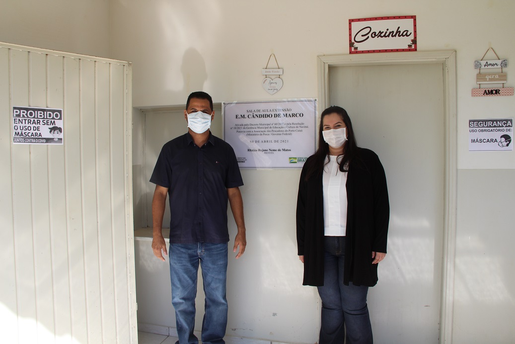 A prefeita Rhaiza Matos, os vereadores Édson Dutra (presidente do Legislativo), André Ricardo Biscaro (Ricck), Onevan Batista do Amaral (Onevanzinho), Regivan Moraes da Silva e a gerente Tatiane Maria Morch (Educação) inauguraram, na manhã de hoje (08-04), a Escola Municipal “Cândido de Marco” – Extensão, no distrito Porto Caiuá.
