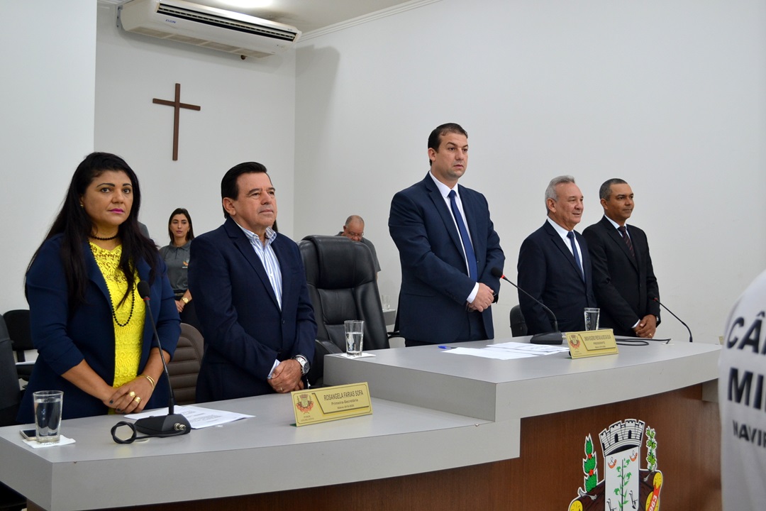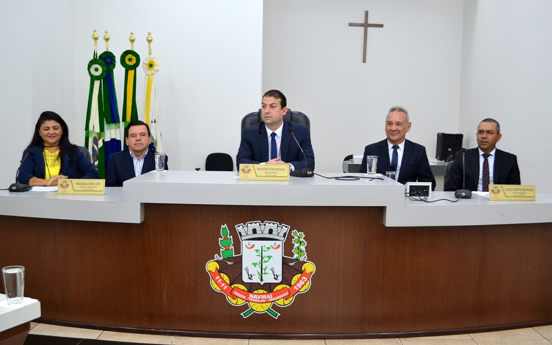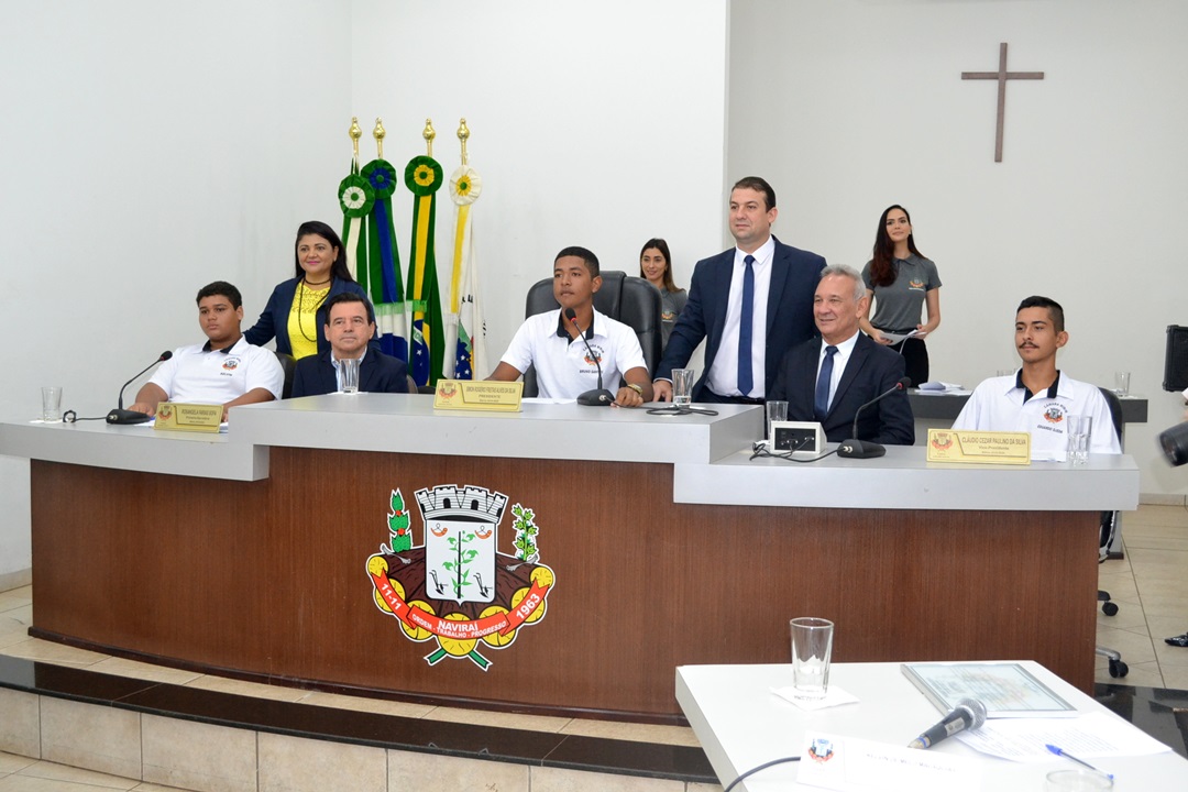 A convite do vereador presidente do Poder Legislativo Municipal, Simon Rogério, o prefeito de Naviraí, Dr. Izauri Macedo, se fez presente no plenário daquela Casa de Leis neste domingo pela manhã, com início as 9 horas, quando sob a coordenação da Mesa Diretora composta pelos vereadores Simon Rogério (presidente), Rosangela Sofa (primeira secretária) e Claudio Cesar Paulino da Silva (vice-presidente convocado para responder pela segunda secretaria), coordenaram a sessão solene de posse dos 13 Vereadores Mirins eleitos em novembro, representando escolas das redes Municipal, Estadual e Particular de nossa cidade, bem como, seus 13 suplentes. Além deles, também fez parte da mesa diretora dos trabalhos dessa reunião, o primeiro suplente de senador José Chagas.