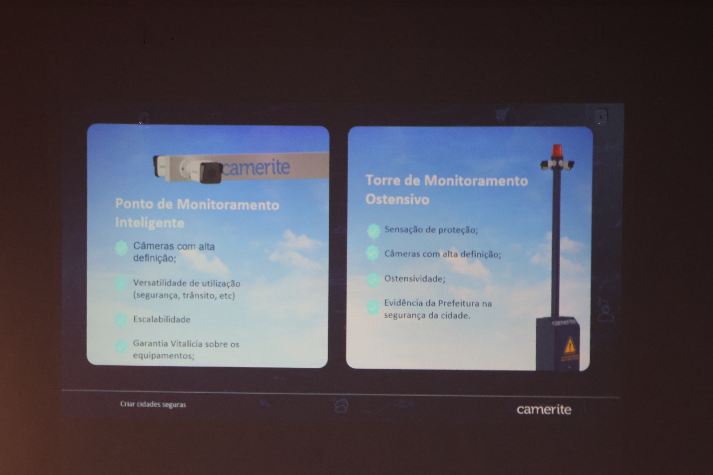 O representante da Camerite, Leornardo Trajano, confirmou a instalação de 50 pontos de monitoramento individual, 05 pontos de monitoramento de leitura de placas com infravermelho e 10 terminais de monitoramento ostensivo com filmagens 24h por dia. O projeto foi complementado com instalação de software de análise dinâmica, que permite selecionar objetos pré-determinados, implantação de infraestrutura como rede e conjuntos de hastes com as câmeras.
