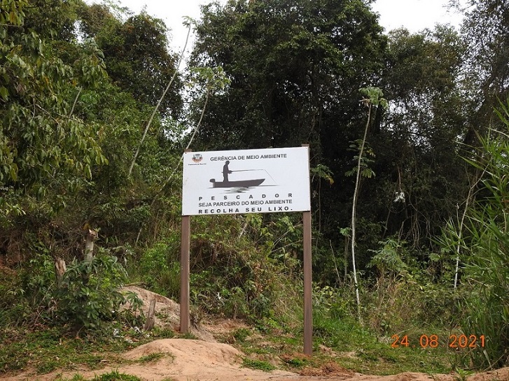 Uma das placas instaladas à margem do rio Amambai pede a conscientização de pescadores e turistas para não jogarem lixo à céu aberto e levarem os resíduos para o descarte.