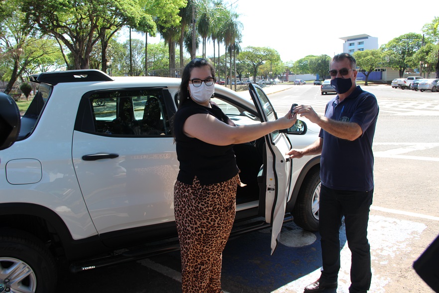 Prefeita Rhaiza Matos entrega chave de pick-up Touro ao gerente do Núcleo de Vigilância Sanitária, médico veterinário José Mário. Foto: Roney Minella