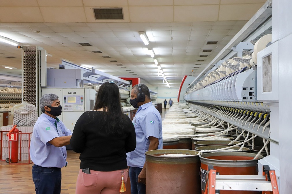 Gestor de Fiação João Câncio e presidente Gervásio Kamitani mostram à prefeita Rhaiza Matos a moderna tecnologia de fabricação de fios de algodão.