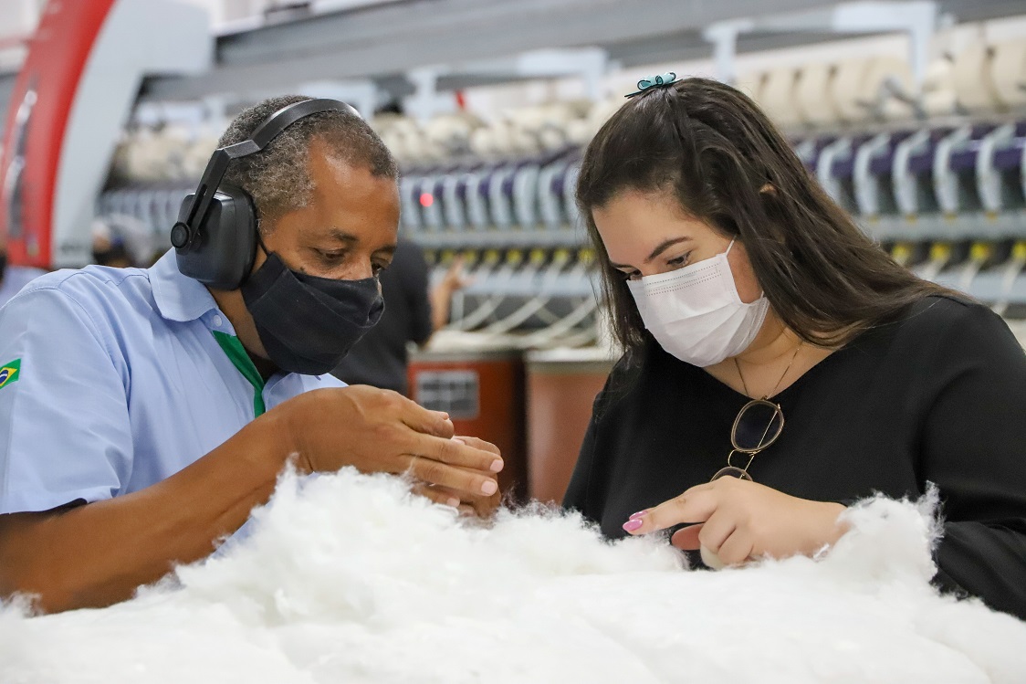 Após a visita à sede administrativa Rhaiza e Fernando visitaram a fábrica de fiação. “A indústria de fiação completou 25 anos no mês passado. Está consolidada no mercado de fios de algodão e fornece fios para as principais malharias e tecelagens de São Paulo e do Sul do Brasil”, informou o gestor de fiação João Câncio Neto, ao mostrar o processo de produção de fios, desde o recebimento do algodão até o produto final em carretéis e embalagens.