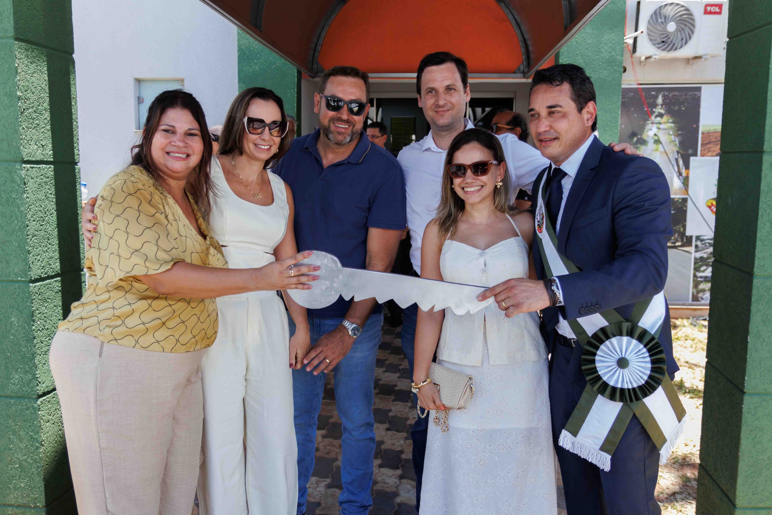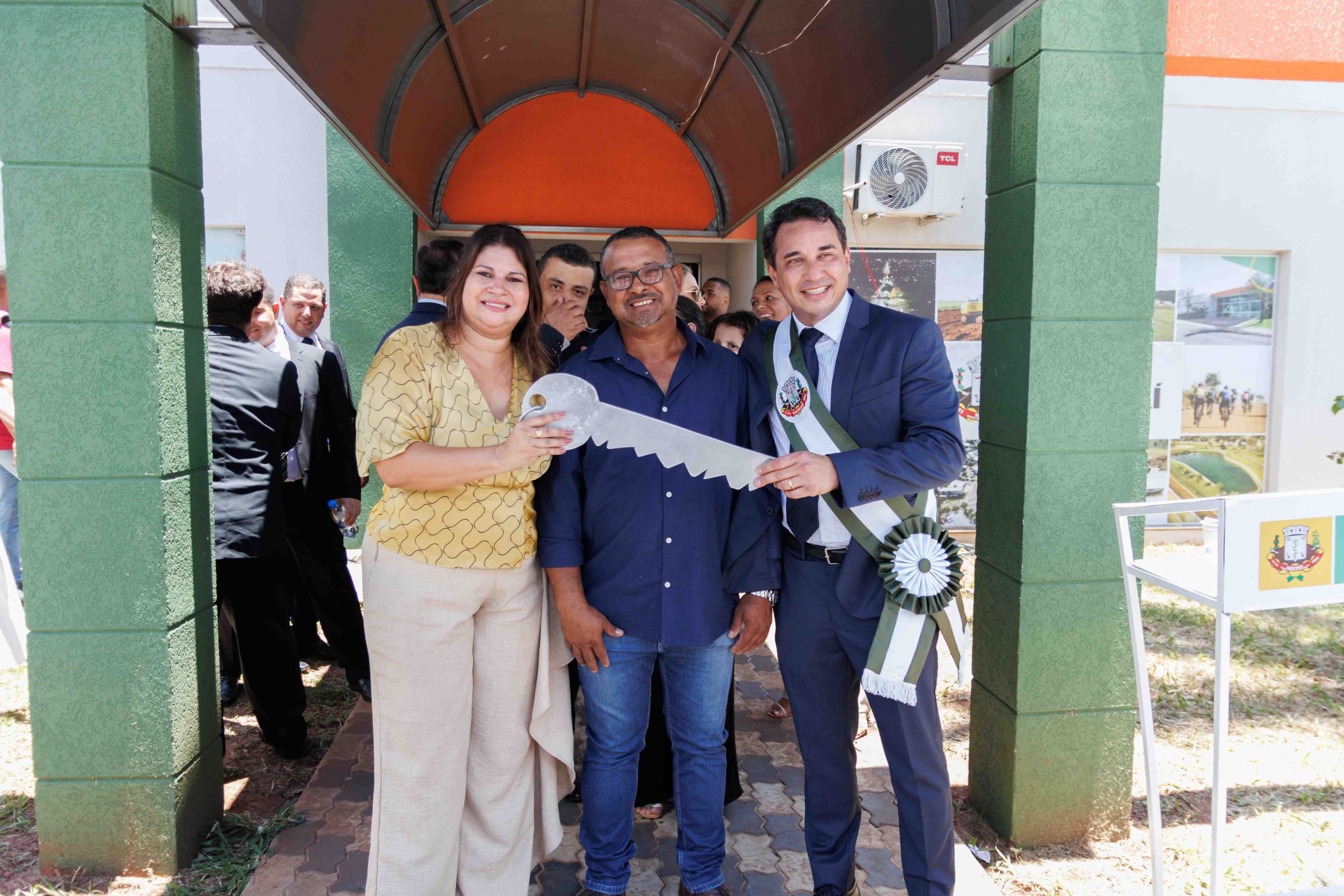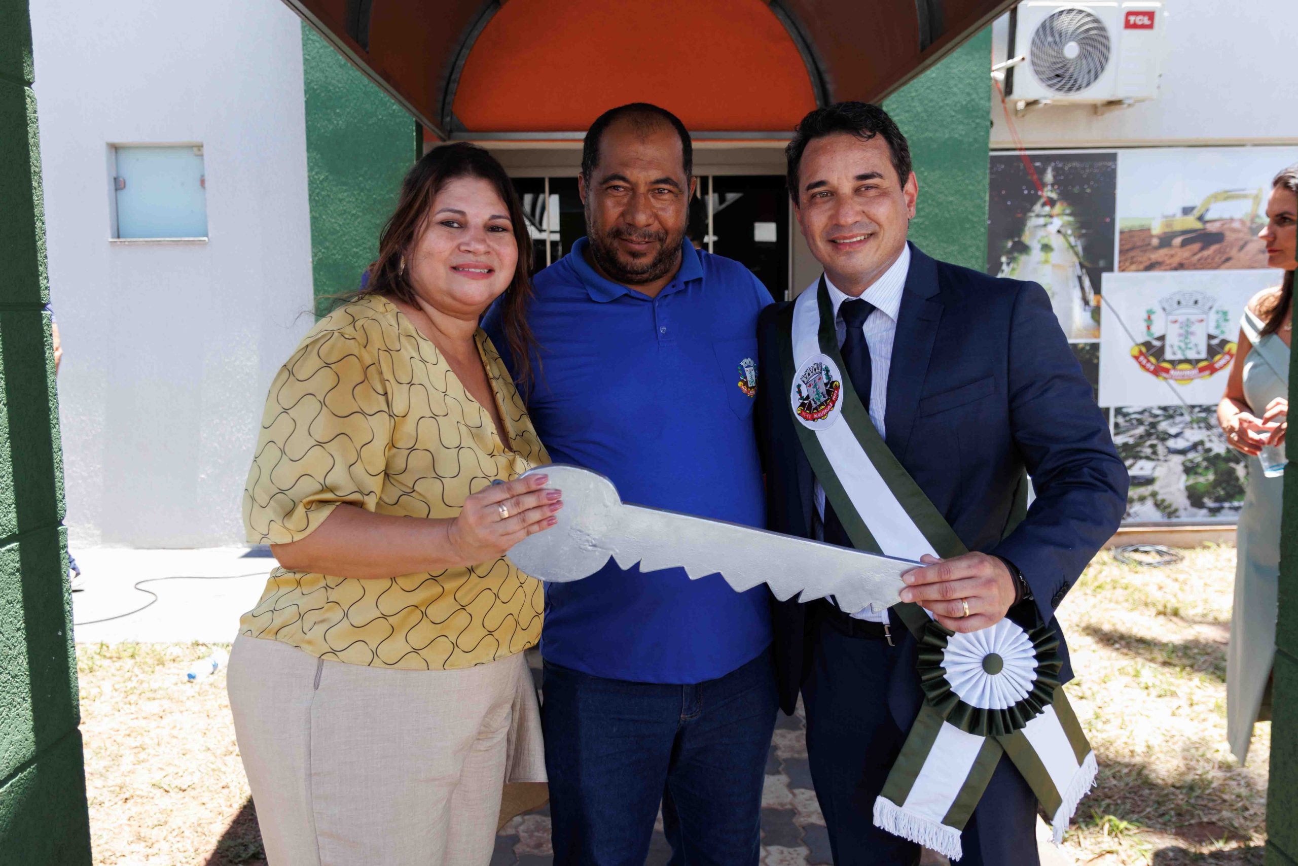 Prefeito Rodrigo Sacuno e Vice-prefeita Telma Minari Prefeito segurando a chave da cidade (Foto: Roni Silva)
