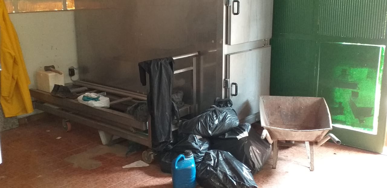 - Câmara fria e maca de transporte de corpos, em sala improvisada do Cemitério Municipal.