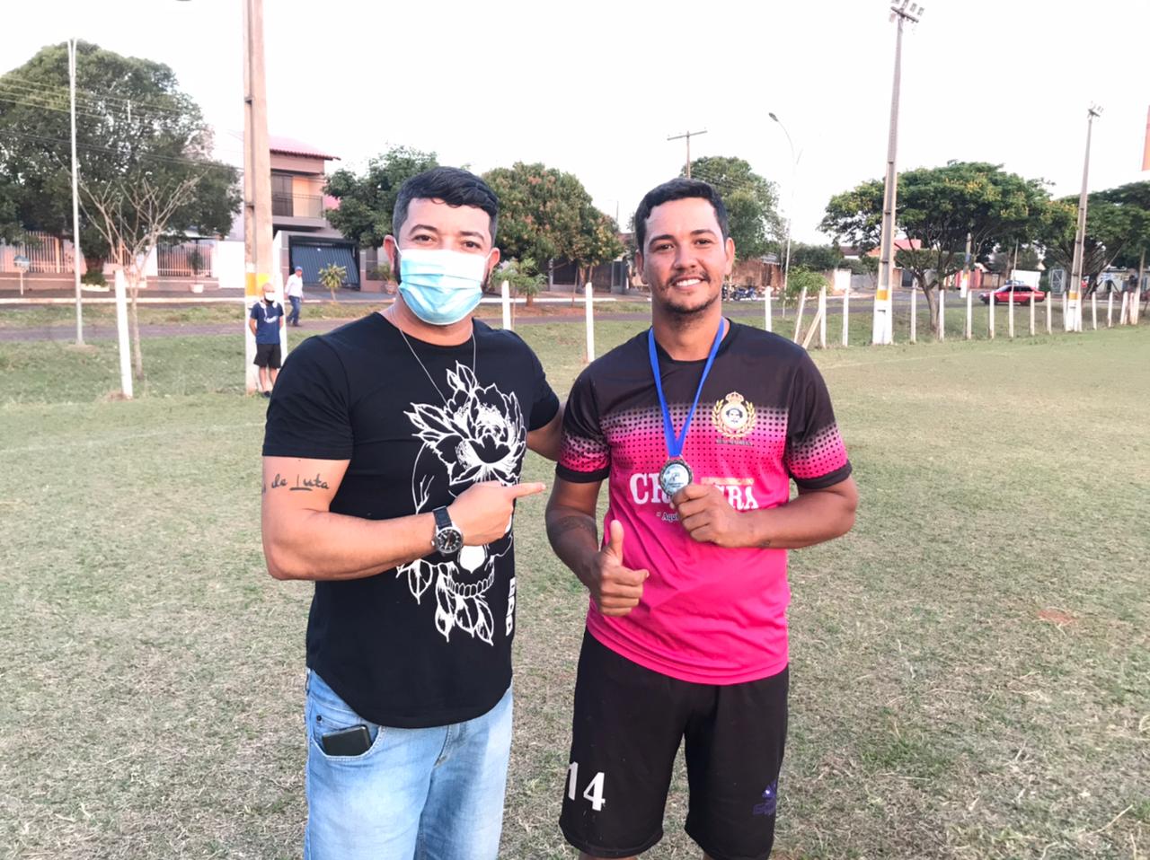 O atleta Eduardo do Santos Silva foi o campeão do 1º Torneio de Pênaltis de Suíço (Categoria Adulto) e recebeu o troféu do gerente de Esporte Brendo Caíque dos Santos. Foto: Festadodia/Marcela Silva