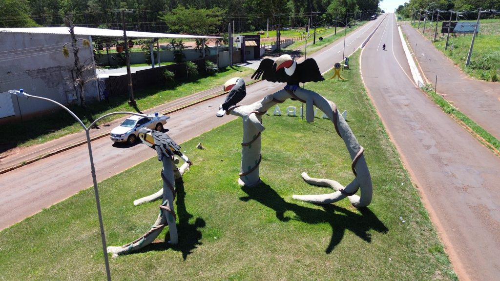 Duas das aves estão posicionadas sobre uma estrutura maior, cujos troncos estilizados formam um arco que molda o nome “NAVIRAÍ”, funcionando como um pórtico de boas-vindas para quem chega à cidade. O tucano mais alto é retratado com as asas abertas. A terceira ave está em uma base separada, ao lado da estrutura principal.